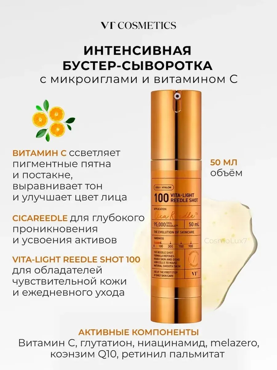 Сыворотка для лица с микроиглами VT Cosmetics Vita-Light Reedle Shot 100 – секрет сияющей и молодой кожи! Антивозрастная сыворотка для лица со спикулой – это инновационное средство ухода, которое обеспечит Вашей коже сияние и упругость. Созданная по последним технологиям корейской косметики, сыворотка глубоко проникает в слои эпидермиса, стимулируя процесс обновления клеток и заметно улучшая состояние кожи. Благодаря микроиглам, сыворотка обеспечивает глубокое проникновение активных компонентов, эффективно разглаживая морщины и стимулируя выработку коллагена, делает кожу более эластичной и упругой. В её составе - мощные активные компоненты. Витамин С – антиоксидант, защищающий кожу от свободных радикалов и стимулирующий выработку коллагена. Ниацинамид 5% – эффективно регулирует выработку себума, уменьшает воспаление и улучшает текстуру кожи. Глутатион – осветляет пигментные пятна и способствует более гладкой коже. Запатентованный Cica Reedle 9.5%, состоящий из спикул и центеллы азиатской успокаивает и восстанавливает кожу, уменьшая воспаление и раздражение. Увлажняющая сыворотка для лица способствует осветлению и отбеливанию пигментации. Формула, обогащенная мощными антиоксидантами, борется с несовершенствами и обеспечивает сияние кожи. Сыворотка помогает сузить поры, регулирует выработку себума, и предотвращает появление жирного блеска, оставляя кожу матовой и свежей. Сыворотка интенсивно увлажняет и питает кожу, выравнивая тон и текстуру. Она идеально подходит как база под макияж, обеспечивая ему стойкость и ровное нанесение. Сыворотка станет прекрасным подарком для любимой женщины, заботящейся о красоте и молодости.