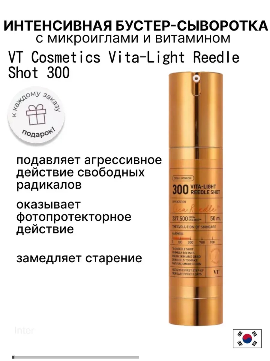 VT Cosmetics Vita-Light Reedle Shot 300, an intensive booster serum with microneedles and vitamin C, has high antioxidant activity, suppresses the aggressive action of free radicals, has a photoprotective effect and slows down aging.