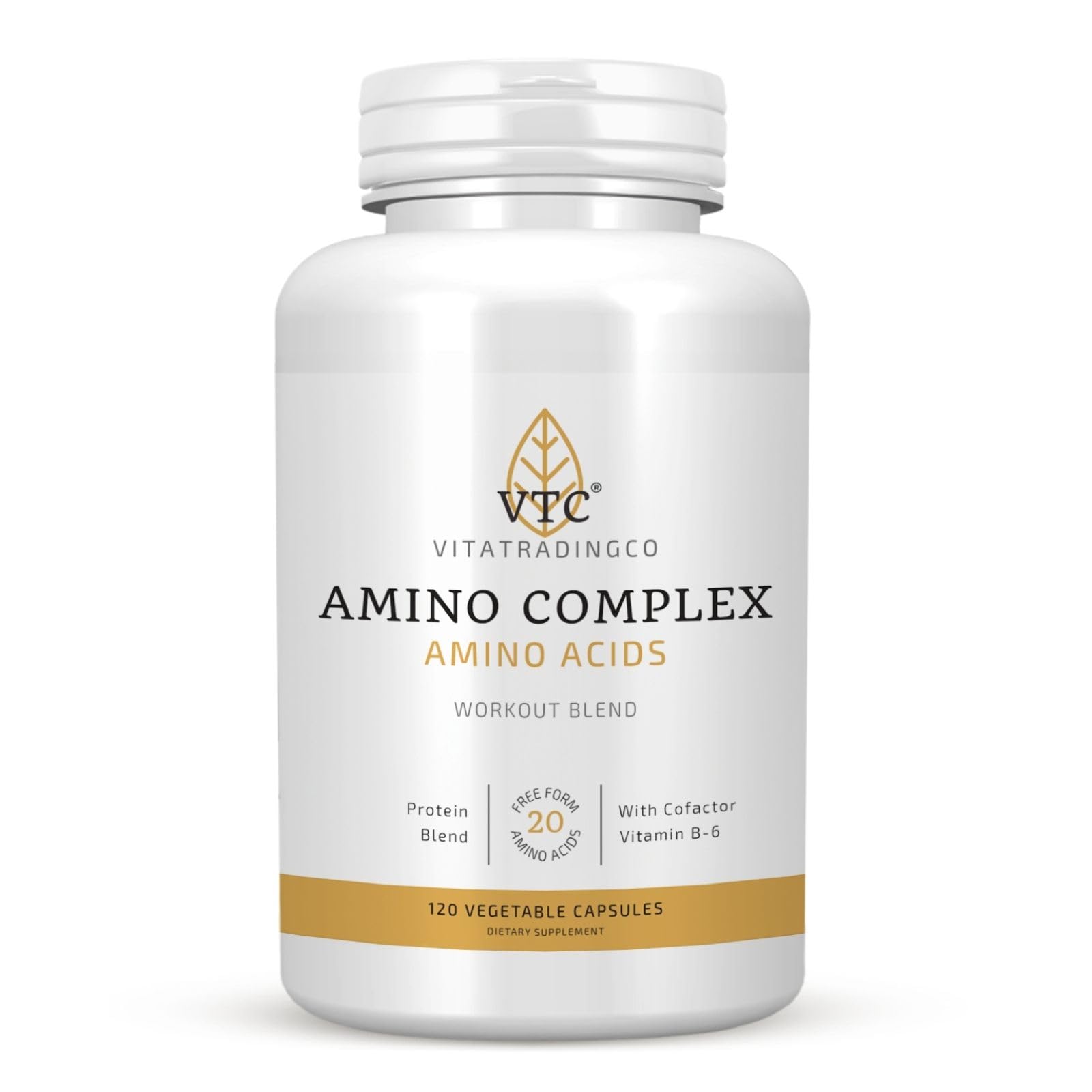 VTC VitaTradingCo. Amino Complex Protein Blend | 20 Free Form Peptide-Bound Amino Acids | with Vitamin B6 | for Muscle Recovery & Growth | 120 Veggie Capsules