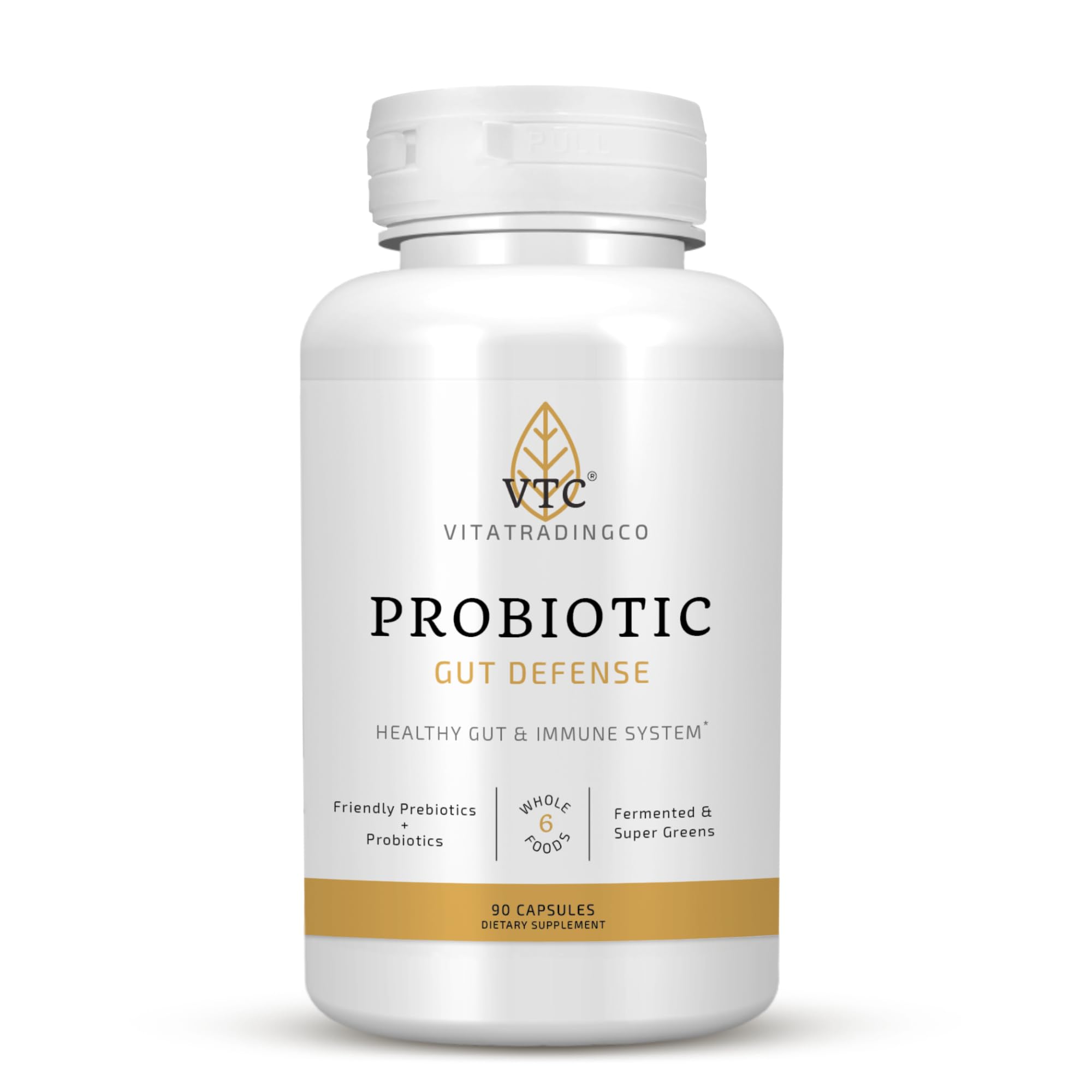 RESPONSIBLE SUSTAINABLE: Vita Trading Co. was founded on the belief that the pursuit of wellness is rooted in the purest and highest quality ingredients that Earth has to offer. Always striving to utilize trusted and responsible ingredients and environmentally conscious packaging, our small, family-run business provides accessible products with a minimalist footprint. QUALITY STANDARDS: Our Probiotic Gut Defense was made with quality in mind. Our capsules are not only non GMO and GMP quality assured, but the probiotic strains used have been tested to verify identity, quality, and potency of each strain in order to remove contaminants and ensure maximum quality. WHOLE FOOD BASE: VTC's active probiotic strains are blended into a whole food base of fermented greens and super green foods such as barley grass, wheat grass, and organic kelp. These whole food greens supply additional vitamins and minerals that support healthy digestion and overall health. PROBIOTIC BLEND: Probiotic Gut Defense features a blend of active probiotics from 1 billion organisms alongside prebiotic fiber derived from blue agave. This combination was designed to help promote a balanced digestive tract and healthy growth of Acidophilus and Bifidus organisms. DAILY GUT DEFENSE: With 13 active bacterial strains along with a blend of whole foods and FOS prebiotic fiber, each serving will provide your intestinal flora the healthy bacteria your gut needs. Probiotic Gut Defense is the perfect starter supplement to get your gut on the right track or to keep it flourishing.