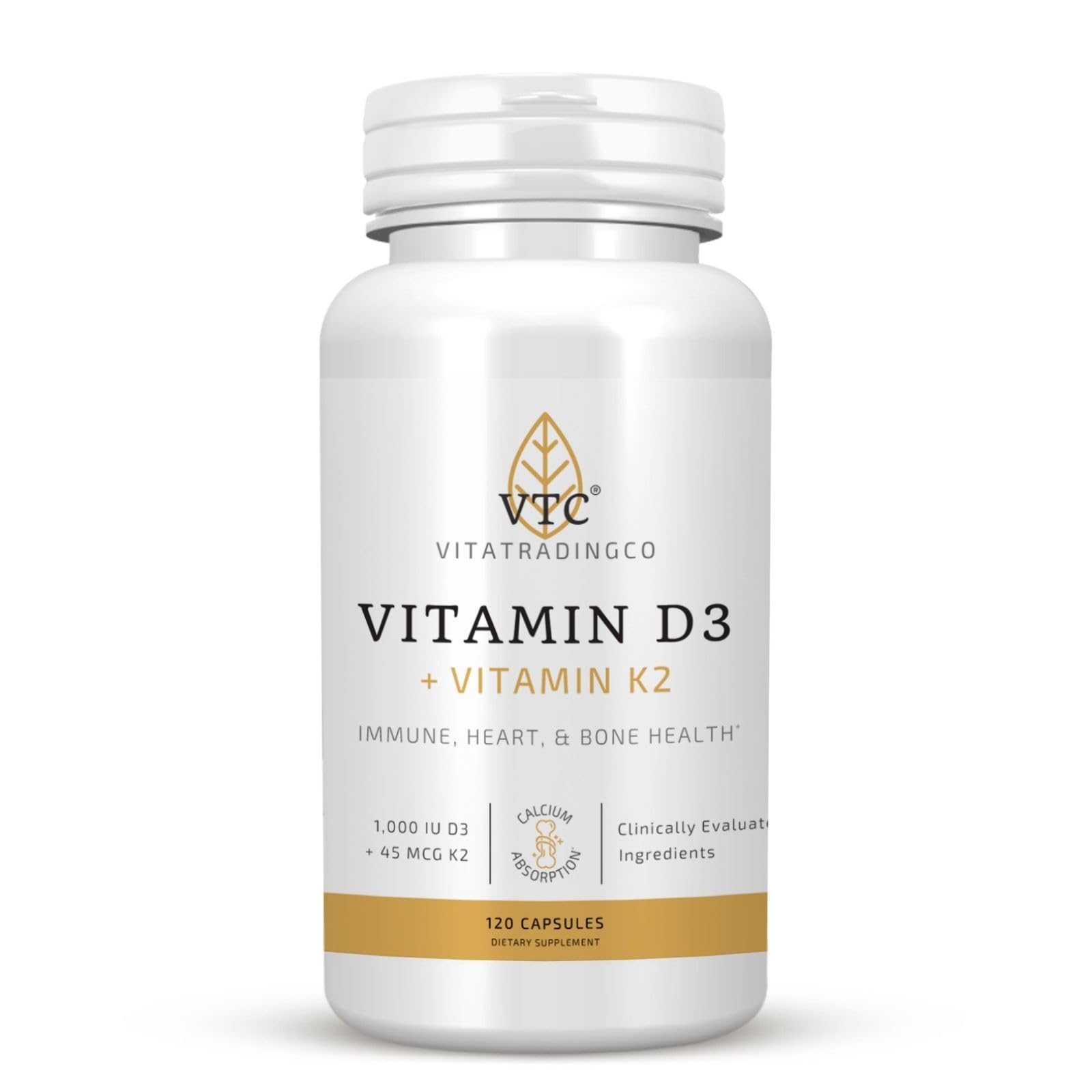 VTC VitaTradingCo. Vitamin D3 + K2 | High Potency Bioactive Forms | 1000iu D3 + 45mcg MK-4 K2 | Boost Calcium Absorption | Immune Heart & Bone Support | 120 Capsules