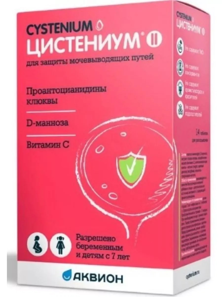 Цистениум II, таблетки для рассасывания - это биологически активная добавка (БАД) к пище, комплекс натуральных растительных веществ с доказанной эффективностью: D-манноза, экстракт клюквы и витамин С. Цистениум II поможет справиться с циститом и предупредить повторные случаи заболевания.