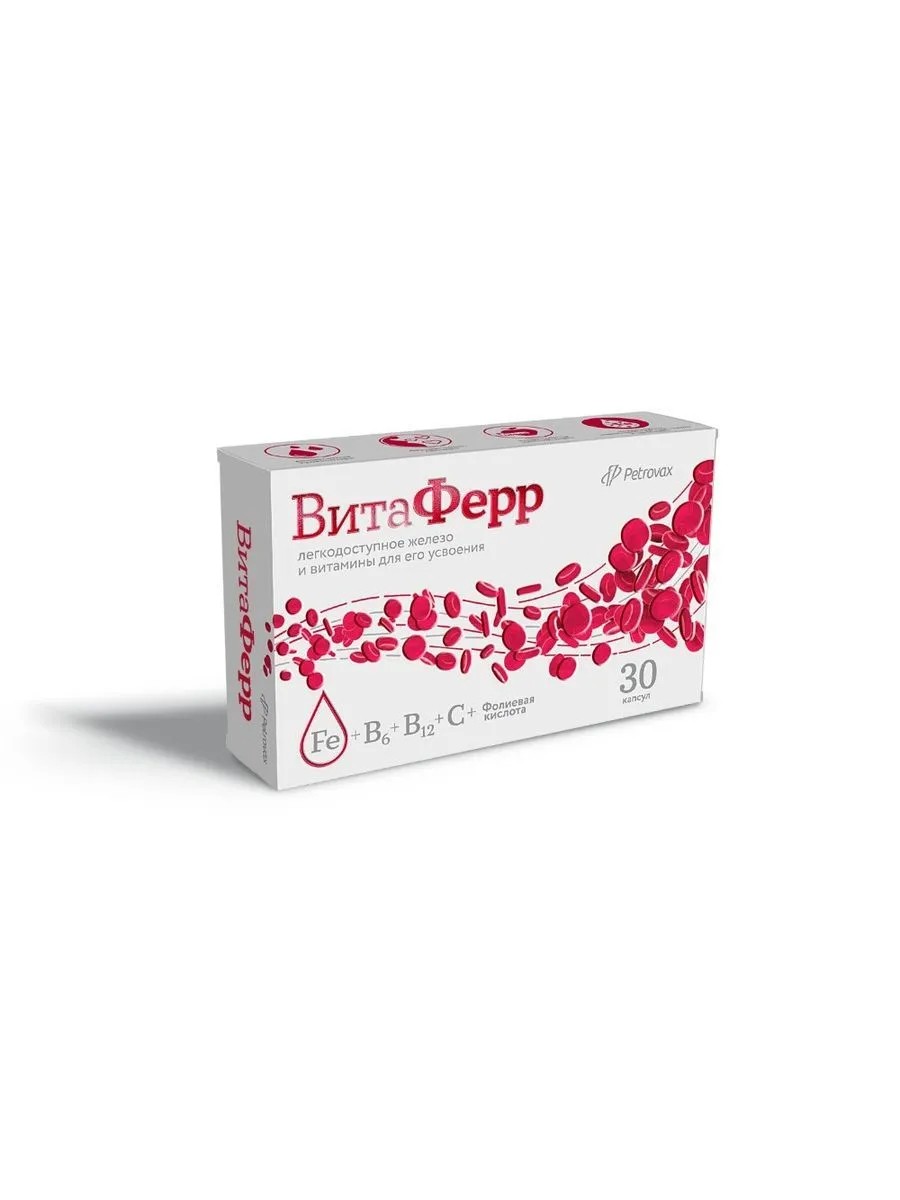 витаферр n30 капс по 375мг. дополнительный источник железа, витаминов с, в6, в12 и фолиевой кислоты для женщин в том числе в период беременности и кормления грудью. в качестве биологически активной добавки к пище. железа бисциглинат, капсула желатиновая, витамин с, носитель: микрокристаллическая целлюлоза, антислеживающие агенты: магниевая соль стеариновой кислоты, диоксид кремния аморфный, метилфолат кальция, витамин в6, витамин в12. для реализации населению в качестве биологически активной добавки к пище (далее согласно приложению). биологически активные вещества, в 1 капсуле: железо - 30 ±4,5 мг, витамин с -70 ±10,5 мг, витамин в6 - 0,7 ±0,11 мг, витамин в12 - 1,25 ±0,19 мкг, фоли-евая кислота - 400 ±60 мкг -