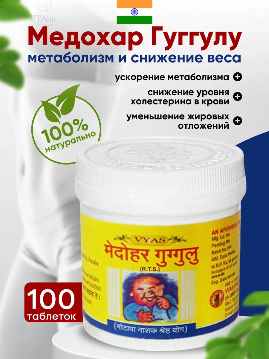 | Package contents | Medohar Guggulu, metabolism and weight loss, 100 tablets |