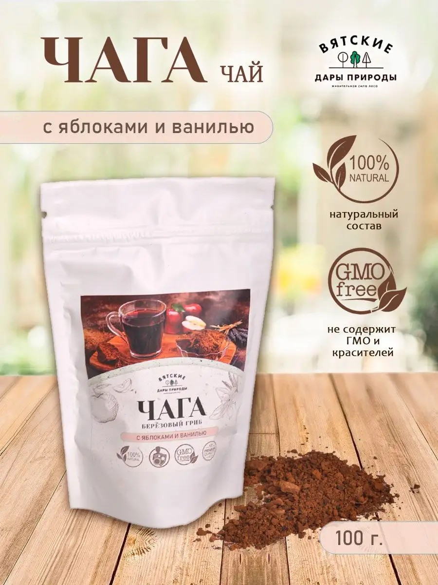 Ароматный чай на основе чаги с яблоками и ванилью сочетает в себе приятный вкус и аромат, пользу исходных ингредиентов.Настой из чаги богат антиоксидантами, микро- и макроэлементами, уникальными органическими соединениями. Чага в процессе роста насыщается бетулином, обладающим широким спектром биологической активности, в том числе антисептическими, противоопухолевыми, антивирусными, гепатопротекторными, антибактериальными, противогрибковыми свойствами.Яблоки придают чаюприятныйаромат, легкойфруктовый вкус. Яблоки богаты пектином, мико- и макроэлементами, витаминами. Напитки с яблоками полезно употреблять при малокровии, автиаминозе, хроническком ревматизме.Ванилин усиливает ароматизацию чая. Приятный вкус и ароматванили оказывают успокаивающее действие на организм, снимают раздражение, устраняют бессонницу, настраивают на хорошие мысли и заряжают позитивным настроением. Комбинированный состав фиточая направлен на повышение иммунитета, борьбу со стрессом, общее укрепление организма, поддержание сил и поднятия настроения, утолению жажды.