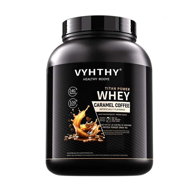 VYHTHY Caramel Coffee Whey Protein Powder – Your Perfect Post-Workout Companion Unlock the full potential of your fitness routine with VYHTHY Whey Protein Powder. Specifically crafted for active individuals, this protein powder delivers 24g of high-quality whey protein per serving to support muscle recovery and growth. Whether you're pushing through a rigorous workout or simply need a daily protein boost, this product is your key to accelerating muscle recovery and building strength. Fast Absorption for Optimal Recovery After an intense workout, your muscles need quick replenishment. Our whey protein is formulated for fast digestion, ensuring immediate absorption to give your muscles the essential nutrients they crave. With an added 5.5g of BCAAs and 11.4g of leucine, it works to speed up muscle repair and reduce soreness, helping you get back to your next workout quicker than ever before. Versatile and Convenient for Any Time of Day Designed for flexibility, VYHTHY Whey Protein is perfect for any time of day. Whether you're preparing for a morning workout, recovering after a tough session, or simply need a midday protein boost, this powder fits seamlessly into your routine. It mixes effortlessly with water, milk, or smoothies, making it easy to enjoy a delicious protein shake whenever you need it. Rich Caramel Coffee Flavor for a Delicious Treat Who says protein shakes can't taste amazing? With its smooth and rich Caramel Coffee flavor, VYHTHY Whey Protein turns every scoop into a treat. No more bland, unappetizing shakes—enjoy the creamy, indulgent taste that makes fueling your body an enjoyable experience. Perfect for Active Lifestyles Whether you're into running, cycling, weightlifting, or maintaining an active daily routine, VYHTHY Whey Protein provides the reliable nutrition you need. With 24g of protein per serving, it supports muscle strength and energy levels, helping you stay strong and ready to tackle whatever comes your way. Experience top-notch quality with VYHTHY and take your active lifestyle to new heights.Designed for Active Lifestyles:From running to cycling, lifting weights to daily fitness routines, this protein powder is designed to fuel your active lifestyle. With 24g of protein per serving, it provides reliable nutrition to keep you strong, energized, and ready for anything your day brings. Experience the quality of VYHTHY. Indulge in the Rich Caramel Coffee Taste:Who said protein can't be delicious? This protein powder is a treat with every scoop, boasting a rich, creamy Caramel Coffee flavor that mixes perfectly with your favorite liquid. It's the protein powder that actually tastes as good as it works—who wouldn't love that?. Versatile Use Anytime for a Protein Boost:Whether you need an energy boost before your morning workout, a recovery shake after a tough session, or a midday snack to keep you going, this protein powder fits into your routine. It mixes easily with water, milk, or smoothies, so you can get your protein boost whenever you need it. Fast Absorption for Quick Recovery:When you push yourself, you need quick results. This protein is formulated for fast digestion and quick absorption, ensuring your muscles get the nutrients they need immediately after exercise. It's designed to help you recover faster, so you're ready to take on the next challenge. 24g of High-Quality Whey Protein for Muscle Recovery:After a tough workout, your muscles crave the best nutrition. This protein powder gives you 24g of high-quality whey protein, 5.5g of BCAAs, and 11.4g of leucine to help you bounce back faster and grow stronger. It's your go-to for both post-workout recovery and a daily protein kick to keep you moving forward.