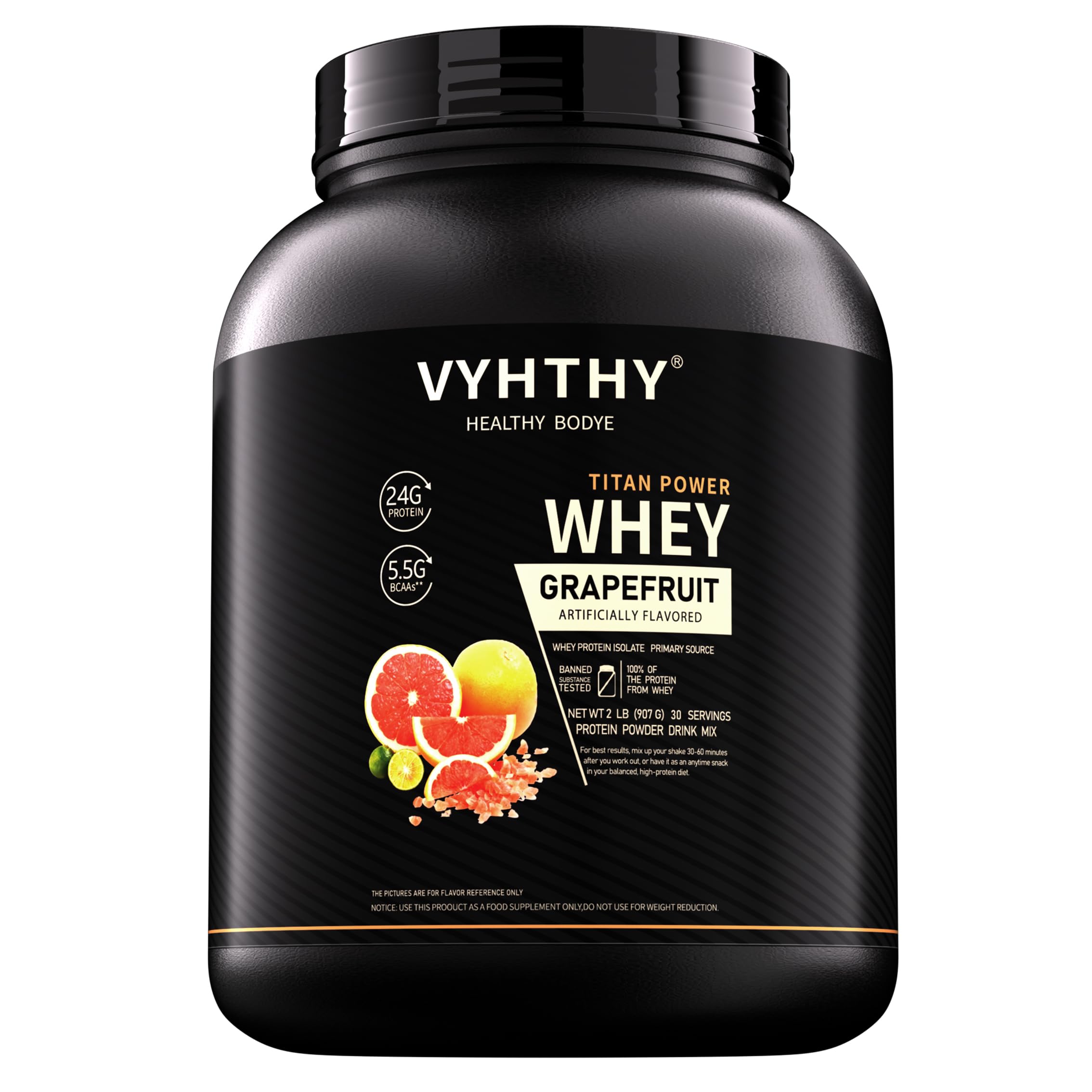 Designed for Active Lifestyles:From running to cycling, lifting weights to daily fitness routines, this protein powder is designed to fuel your active lifestyle. With 24g of protein per serving, it provides reliable nutrition to keep you strong, energized, and ready for anything your day brings. Experience the quality of VYHTHY. Indulge in the Rich Grapefruit Taste:Who said protein can't be delicious? This protein powder is a treat with every scoop, boasting a rich, creamy chocolate flavor that mixes perfectly with your favorite liquid. It's the protein powder that actually tastes as good as it works—who wouldn't love that?. Versatile Use Anytime for a Protein Boost:Whether you need an energy boost before your morning workout, a recovery shake after a tough session, or a midday snack to keep you going, this protein powder fits into your routine. It mixes easily with water, milk, or smoothies, so you can get your protein boost whenever you need it. Fast Absorption for Quick Recovery:When you push yourself, you need quick results. This protein is formulated for fast digestion and quick absorption, ensuring your muscles get the nutrients they need immediately after exercise. It's designed to help you recover faster, so you're ready to take on the next challenge. 24g of High-Quality Whey Protein for Muscle Recovery:After a tough workout, your muscles crave the best nutrition. This protein powder gives you 24g of high-quality whey protein, 5.5g of BCAAs, and 11.4g of leucine to help you bounce back faster and grow stronger. It's your go-to for both post-workout recovery and a daily protein kick to keep you moving forward.