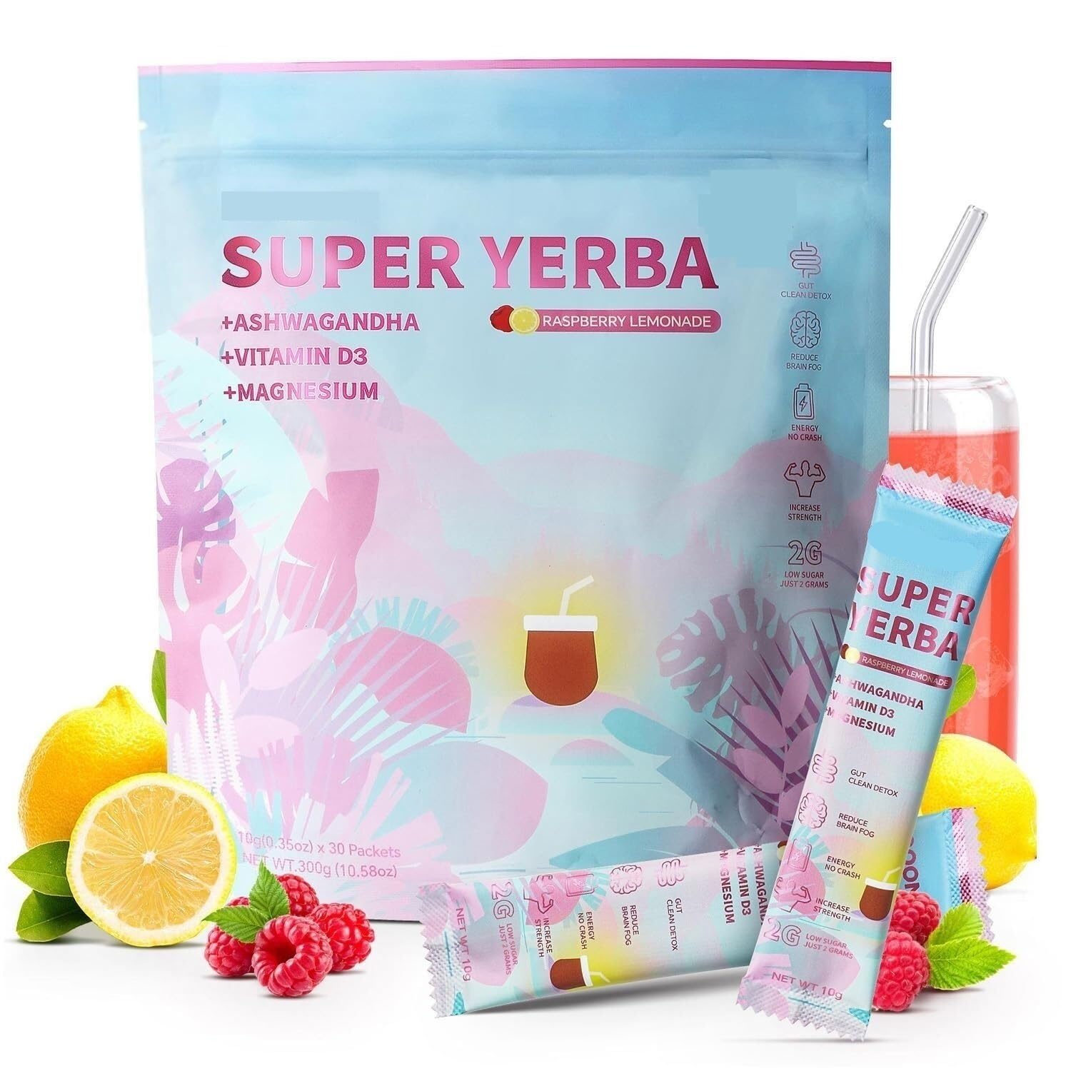 Super Yerba Maté instantané en poudre - 30 sachets de thé instantané - Saveur framboise et limonade - Portions pour plus d'énergie - Concentration - Aide à lutter contre le brouillard cérébral 1 pièce.