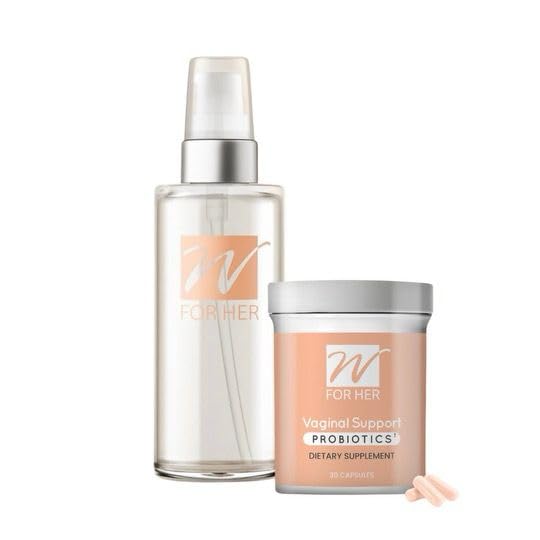 Complete Feminine Wellness Care WforHer brings you a thoughtful bundle designed to support comfort, balance, and confidence—inside and out. This two-piece set includes our clinically researched Vaginal Probiotic and our silky, body-safe Personal Moisturizer, working together to promote daily feminine wellness. Support Vaginal Balance Freshness Formulated with a proprietary blend of three scientifically backed probiotic strains, WforHer Vaginal Probiotic helps maintain healthy flora, support yeast balance, and promote optimal vaginal pH. Clinical trials show results in as little as 7 days, helping you feel fresh and comfortable every day. Nourishing Daily Hydration Our Personal Moisturizer is made with just three clean, effective ingredients—dimethicone, dimethiconol, and Vitamin E—to soothe dryness and protect sensitive skin. Free from parabens, PFAS, phthalates, fragrances, and glycerin, it's designed to provide silky, non-irritating comfort with just a few drops. Gentle Easy to Use Both products are designed with your daily routine in mind. The probiotic capsules are small, smooth, and easy to swallow—gentle on digestion and effective with or without food. The moisturizer comes in a convenient pump bottle, water-resistant yet easy to wash off, offering all-day hydration wherever you need it. Sustainably Made Trusted Quality WforHer is committed to women's health and the planet. Our moisturizer is packaged in reusable and recyclable glass bottles with eco-friendly labeling and protective cylindrical containers. All products are manufactured in the USA in FDA-registered, GMP-certified facilities with carefully sourced ingredients. Who We Are At WforHer, we go beyond products—we are a community devoted to women's wellness, offering solutions, education, and resources at every stage of life. From daily comfort to long-term care, this bundle is designed to help you feel balanced, confident, and supported every day.Who We Are – WforHer is a community devoted to the enhancement of women's wellness where they can thrive at any age. WforHer offers not just products, but resources and informative articles providing education and solutions for many of women's needs at every milestone of their lives from pre- and post-menopausal supplements, to UTI prevention, and beyond. Designed for comfort: WforHer Personal Moisturizer is a silky, body-friendly formulation that won't irritate your skin. Just a few drops daily will ease personal dryness, ensuring comfort every moment of the day. Simple and safe: Our formulation consists of just three simple ingredients (dimethicone, dimethiconol and Vitamin E) to protect your skin and reduce irritation. It does not contain preservatives or harmful chemicals that could harm the earth or your skin. The emollients and skin conditioners in WforHer personal moisturizer are safe for any skin type. Our formula is fragrance-free, and contain no parabens, PFAS, phthalates, or glycerin. Our formulation is designed exclusively for women from a proprietary blend of three specific strains of probiotics, each offering strong scientific evidence to support its benefits for vaginal health. Clinical trials show results in as little as 7 days. Supports Vaginal Wellness – WforHer is formulated with clinically researched ingredients proven to help support healthy vaginal flora, vaginal yeast and pH balance, keeping you fresh and comfortable everyday.
