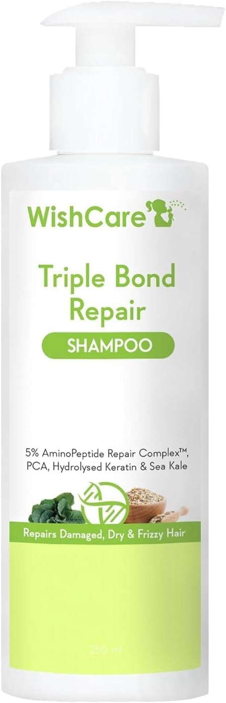 W'ishCare, Triple Bond Repair Shampoo for Dry Frizzy Hair - 5 AminoPeptide Complex PCA - Repairs Damaged Frizzy HairHOW TO USE : Apply on wet hair and massage gently with fingertips. Work on the lather for afew minutes and let the complex do its magic. Shampoo twice and rinse thoroughly with cold water. Follow it up with Triple Bond Repair Booster Serum for the best results. Do not expect as much foaming as in harsh sulphate based shampoos. SAFE POWERFUL FOR ALL HAIR TYPES:Triple Bond Repair Hair Range is infused with our proprietary patent pending blend along with other ingredients to make it a powerful yet gentle formula for all hair types and repairs damage from bleach, color, chemical and heat by restoring natural hair back to you. BIOMIMETIC RECONSTRUCTION : This shampoo has amino acids and polypeptide chains which mimic the polypeptide structure of hair and act as natural fillers for damaged hair thereby naturally reconstructing the hair strands. 5 AMINOPEPTIDE REPAIR COMPLEX - Our proprietary patent pending complex with L-Arginine, Lactic Acid, Ceramides, Sea Kale Extract, Hydrolyzed Hair Proteins, Oligopeptide-2 D- Panthenol helps to repair all hair layers and bonds. REPAIRS DAMAGED, DRY FRIZZY HAIR - Triple Bond Repair Shampoo comes with the power of Multi Peptides, Hair Proteins Sea Kale which helps in repairing hair bonds at the molecular level to give you a healthy, moisturized and frizz free hair. REPAIRS 3 LAYERS 3 TYPES OF BOND : Triple Bond Repair repair both 3 layers of hair - Medula, Cortex and Cuticles and also 3 types of hair bonds - Disulphide (Covalent), Ionic and Hydrogen to give you long lasting strength and making your hair resistant to future damage too.
