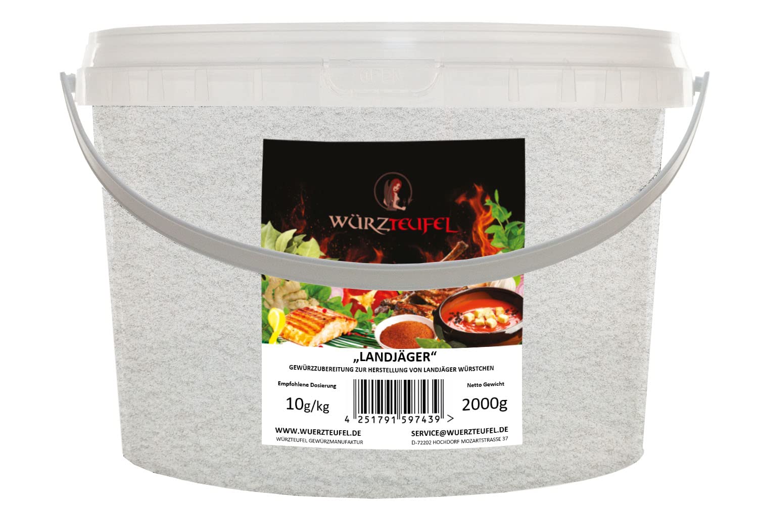 Landjäger - the very popular raw-matured, smoked and air-dried sausage specialty mentioned here, has been produced in many regions of southern Germany, Austria and of course Switzerland since the 19th century. How exactly the raw sausage got its unusual name, which in Switzerland was then equivalent to police officers, is unclear today. The tight, square shape of the sausage, its strong red color, which then matched the color of the police uniform, and the property that the raw sausage could be stored for days without refrigeration and could therefore withstand long applications undamaged. one could suspect that our Alpine neighbors dedicated their then invention of the "uniformed Guard" to their then invention. ________________________________________________________________________________________________________________________________________________________________________________ Germany is famous for its huge variety of different types of sausages. But it's not just the big choice that the makes German sausage world famous. The best quality, excellent taste and the proverbial freshness are the decisive factors Factors that make the best sausage from a good sausage. The right herb obviously plays a very decisive role in this. Herbal Devil has an exquisite selection of the most popular herbal mixtures in Germany for you. Free from any artificial additives. Pure taste for the most popular sausage types in Germany and the best conditions for your success. _________________________________________________________________________________________________________________________________________ For more offers or more accurate product information on the topic of healthy living and enjoyment, visit us on the internet, or write us a message directly via customer request INGREDIENTS Ground spices (black pepper, white pepper, coriander, cumin, nut blossom, garlic), fine-grained edible salt, dextrose, edible spices, herbal extracts (caraway, cummin, nutmeg blossom), essential spices.Landjäger – specerijen, aromatische ruwe worst – kruidenbereiding zonder additieven. PE - emmer 2000 g (2,0 kg) Landjäger - de hier genoemde zeer populaire rauhgerijpte, gerookte en slechts gedurende korte tijd luchtgedroogde worstspecialiteit, wordt al sinds de 19e eeuw in veel regio's van Zuid-Duitsland, Oostenrijk en natuurlijk Zwitserland geproduceerd. Hoe precies de ruwe worst tot haar ongewone naam kwam, die in Zwitserland toen gelijk was aan politieagenten, is vandaag onduidelijk. De strakke, vierkante vorm van de worst, zijn krachtige rode kleur, die toen overeenkomt met de kleur van het politieuniform, en de eigenschap dat de ruwe worst gedurende dagen zonder koeling bewaarbaar was en dus onbeschadigd ook lange toepassingen doorstaan. kon het vermoeden dat onze Alpenburen hun toenmalige uitvinding van de "uniformed Garde" hebben gewijd aan hun toenmalige uitvinding. ________________________________________________________________________________________________________________________________________________________________________________ Duitsland is beroemd om zijn enorme verscheidenheid aan verschillende worstsoorten. Maar het is niet alleen de grote keuze die de Duitse worst wereldberoemd maakt. De beste kwaliteit, uitstekende smaak en de spreekwoordige frisheid zijn de beslissende Factoren die de beste worst maken van een goede worst. Het juiste kruid speelt daarbij natuurlijk een heel beslissende rol. Kruidenduivel heeft voor jou een uitgelezen selectie van de populairste kruidenmengsels in Duitsland. Vrij van elke kunstmatige additieven. Pure smaak voor de populairste worstsoorten in Duitsland en de beste voorwaarden voor jouw succes. ____________________________________________________________________________________________________________________________________ Voor meer aanbiedingen of nauwkeurigere productinformatie over het thema gezond leven en genieten, bezoek ons op het internet, of schrijf ons een bericht rechtstreeks via -klantenverzoek INGREDIËNTEN Kruiden vermalen (peper zwart, peper wit, koriander, komij, nootbloesem, knoflook), fijnkorrelig eetzout, druivensuiker, eetkruiden, kruidenextracten (liefstok, kommijn, muskaatbloesem), etherische specerijen.