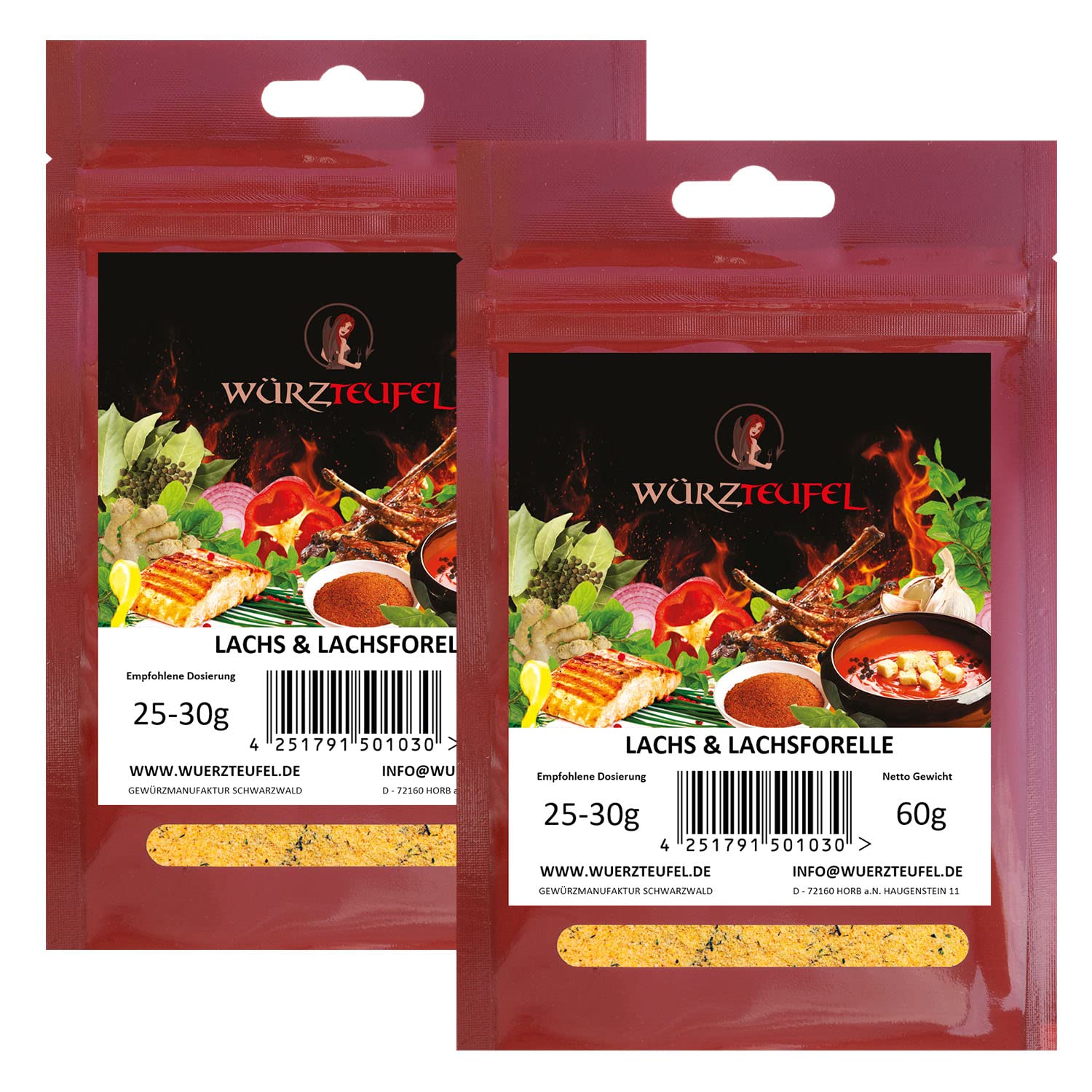 Salmon and in our waters the almost local salmon or rainbow trout are among the most popular fish species. not only in Germany, but also throughout Europe. The breeding of this noble fish is a real science that requires a lot of work required. However, usually just a little bit is enough to understand that every second is worth it. On condition of course You have the right spice mix at hand. With herb devil 'salmon salmon trout' with freshly ground green pepper, finest dill tips and the Best from fresh cream, the salmon tastes so unique, juicy and delicious. ______________________________________________________________________________________________________________________________________________________________ Herb Devil's fine grilling and roasting spices are harmonious spice mixtures composed over the years of experience. They consist of a large number of high-quality, ground natural herbs, pure herbal extracts and pure herbal oils. The spice is thus distributed particularly evenly over the meat surface and develops in just a few minutes full spice eight. Non-iodised food salt and sugars, such as dextrose and grape sugar, are used as carriers for herbal extracts maltodextrin used. If the recommended dosage is adhered to, no additional salt needs to be added. The fine sugar caramelizes on the grill and gives your barbecue evening a touch of barbecue feeling. ________________________________________________________________________________________________________________________________________ For more offers or more accurate product information on the topic of healthy living and enjoyment, visit us on the internet, or write us a message directly via customer request INGREDIENTS spices and herbs (nutmeg, white and green pepper, dill tips, paprika, onions, cayenne pepper), dextrose (grape sugar), fine sea salt, herbal extracts and spices, maroma.Zalm en zalmforel. Grill - specerijen voor vis. Viskruiden, grill en braadkruid. 2 zakken van elk 60 g (120 g) De zalm en ook in onze wateren de bijna al lokale zalm- of regenboogforellen behoren tot de populairste vissoorten. niet alleen in Duitsland, maar ook in heel Europa. De kweek van deze edele vis is een echte wetenschap die veel werk vereist. Echter, meestal is slechts een kleine beetje voldoende om te begrijpen dat elke seconde waarde. Op voorwaarde natuurlijk Je hebt de juiste kruidenmix bij de hand. Met kruidenduivel 'zalm zalmforel' met vers gemalen groene peper, fijnste dilpunten en de Het beste uit verse room, smaakt de zalm zo uniek, sappig en lekker. ____________________________________________________________________________________________________________________________________________________________ Kruidenduivel's fijne grill- en braadkruiden zijn in jarenlange ervaring samengestelde, harmonieuze kruidenmengsels. Ze bestaan uit een groot aantal hoogwaardige, gemalen natuurlijke kruiden, pure kruidenextracten en pure kruidenoliën. Zo verdeelt het specerijen zich bijzonder gelijkmatig over het vleesoppervlak en ontwikkelt in slechts enkele minuten zijn volledige kruidacht. Als draagstof voor kruidenextracten wordt ongejodeerd voedingszout en suikersoorten, zoals druivensuiker en maltodextrine gebruikt. Bij naleving van de aanbevolen dosering hoeft geen extra eetzout te worden toegevoegd. De fijne suiker karamelliseert op de grill en geeft je barbecue-avond een vleugje barbecue-gevoel. ________________________________________________________________________________________________________________________________________ Voor meer aanbiedingen of nauwkeurigere productinformatie over het thema gezond leven en genieten, bezoek ons op het internet, of schrijf ons een bericht rechtstreeks via -klantenverzoek INGREDIËNTEN specerijen en kruiden (nootmuskaat, witte en groene peper, dilpunten, paprika, uien, cayennepeper), dextrose (druivensuiker), fijn zeezout, kruidenextracten en specerijen, maroma.
