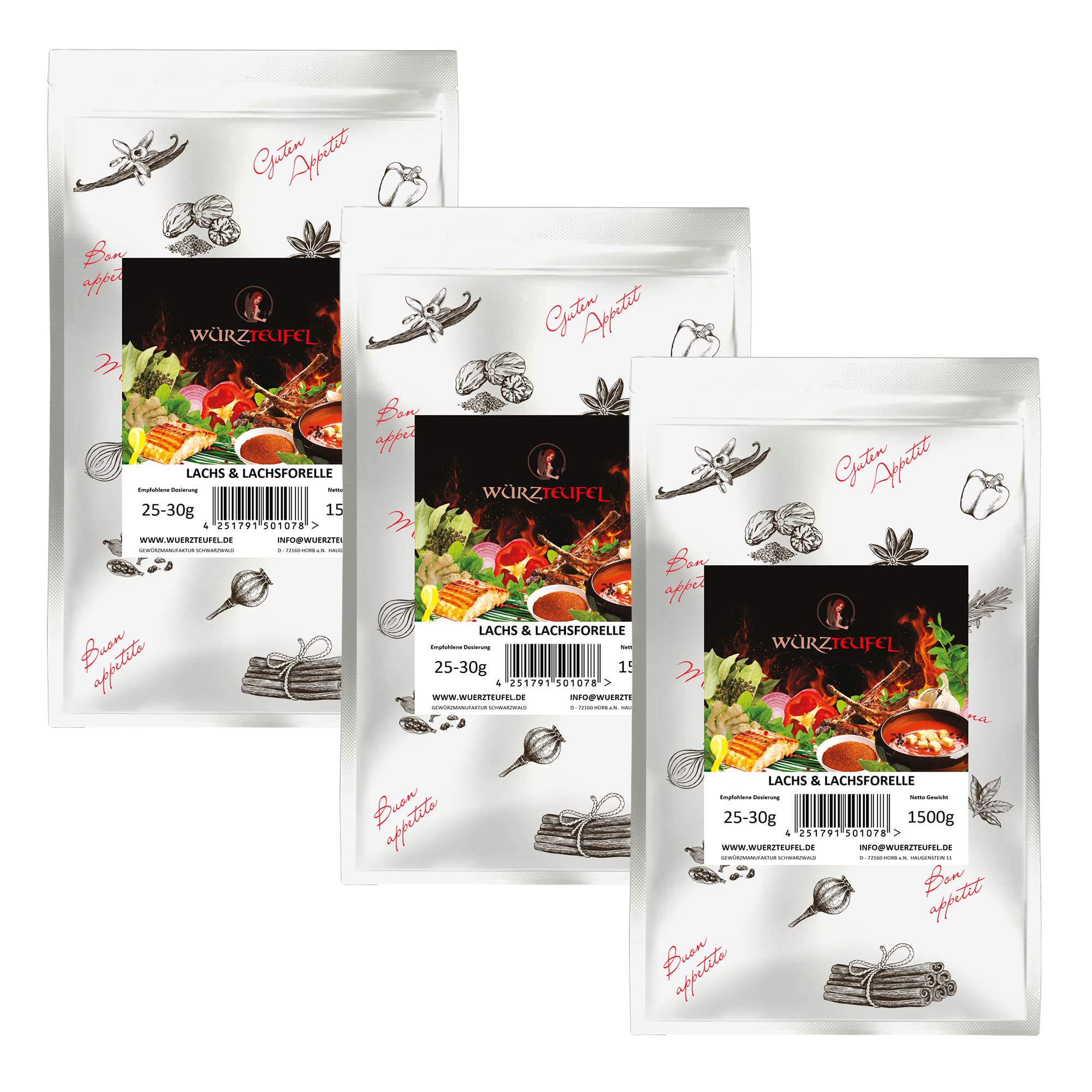 Salmon and in our waters the almost local salmon or rainbow trout are among the most popular fish species. not only in Germany, but also throughout Europe. The breeding of this noble fish is a real science that requires a lot of work required. However, usually just a little bit is enough to understand that every second is worth it. On condition of course You have the right spice mix at hand. With herb devil 'salmon salmon trout' with freshly ground green pepper, finest dill tips and the Best from fresh cream, the salmon tastes so unique, juicy and delicious. ______________________________________________________________________________________________________________________________________________________________ Herb Devil's fine grilling and roasting spices are harmonious spice mixtures composed over the years of experience. They consist of a large number of high-quality, ground natural herbs, pure herbal extracts and pure herbal oils. The spice is thus distributed particularly evenly over the meat surface and develops in just a few minutes full spice eight. Non-iodised food salt and sugars, such as dextrose and grape sugar, are used as carriers for herbal extracts maltodextrin used. If the recommended dosage is adhered to, no additional salt needs to be added. The fine sugar caramelizes on the grill and gives your barbecue evening a touch of barbecue feeling. ________________________________________________________________________________________________________________________________________ For more offers or more accurate product information on the topic of healthy living and enjoyment, visit us on the internet, or write us a message directly via customer request INGREDIENTS spices and herbs (nutmeg, white and green pepper, dill tips, paprika, onions, cayenne pepper), dextrose (grape sugar), fine sea salt, herbal extracts and spices, maroma.Zalm en zalmforel. Grill - specerijen voor vis. Viskruiden, grill en braadkruid. 3 XL - zakje van 1500 g (4,5 kg) De zalm en ook in onze wateren de bijna al lokale zalm- of regenboogforellen behoren tot de populairste vissoorten. niet alleen in Duitsland, maar ook in heel Europa. De kweek van deze edele vis is een echte wetenschap die veel werk vereist. Echter, meestal is slechts een kleine beetje voldoende om te begrijpen dat elke seconde waarde. Op voorwaarde natuurlijk Je hebt de juiste kruidenmix bij de hand. Met kruidenduivel 'zalm zalmforel' met vers gemalen groene peper, fijnste dilpunten en de Het beste uit verse room, smaakt de zalm zo uniek, sappig en lekker. ____________________________________________________________________________________________________________________________________________________________ Kruidenduivel's fijne grill- en braadkruiden zijn in jarenlange ervaring samengestelde, harmonieuze kruidenmengsels. Ze bestaan uit een groot aantal hoogwaardige, gemalen natuurlijke kruiden, pure kruidenextracten en pure kruidenoliën. Zo verdeelt het specerijen zich bijzonder gelijkmatig over het vleesoppervlak en ontwikkelt in slechts enkele minuten zijn volledige kruidacht. Als draagstof voor kruidenextracten wordt ongejodeerd voedingszout en suikersoorten, zoals druivensuiker en maltodextrine gebruikt. Bij naleving van de aanbevolen dosering hoeft geen extra eetzout te worden toegevoegd. De fijne suiker karamelliseert op de grill en geeft je barbecue-avond een vleugje barbecue-gevoel. ________________________________________________________________________________________________________________________________________ Voor meer aanbiedingen of nauwkeurigere productinformatie over het thema gezond leven en genieten, bezoek ons op het internet, of schrijf ons een bericht rechtstreeks via -klantenverzoek INGREDIËNTEN specerijen en kruiden (nootmuskaat, witte en groene peper, dilpunten, paprika, uien, cayennepeper), dextrose (druivensuiker), fijn zeezout, kruidenextracten en specerijen, maroma.