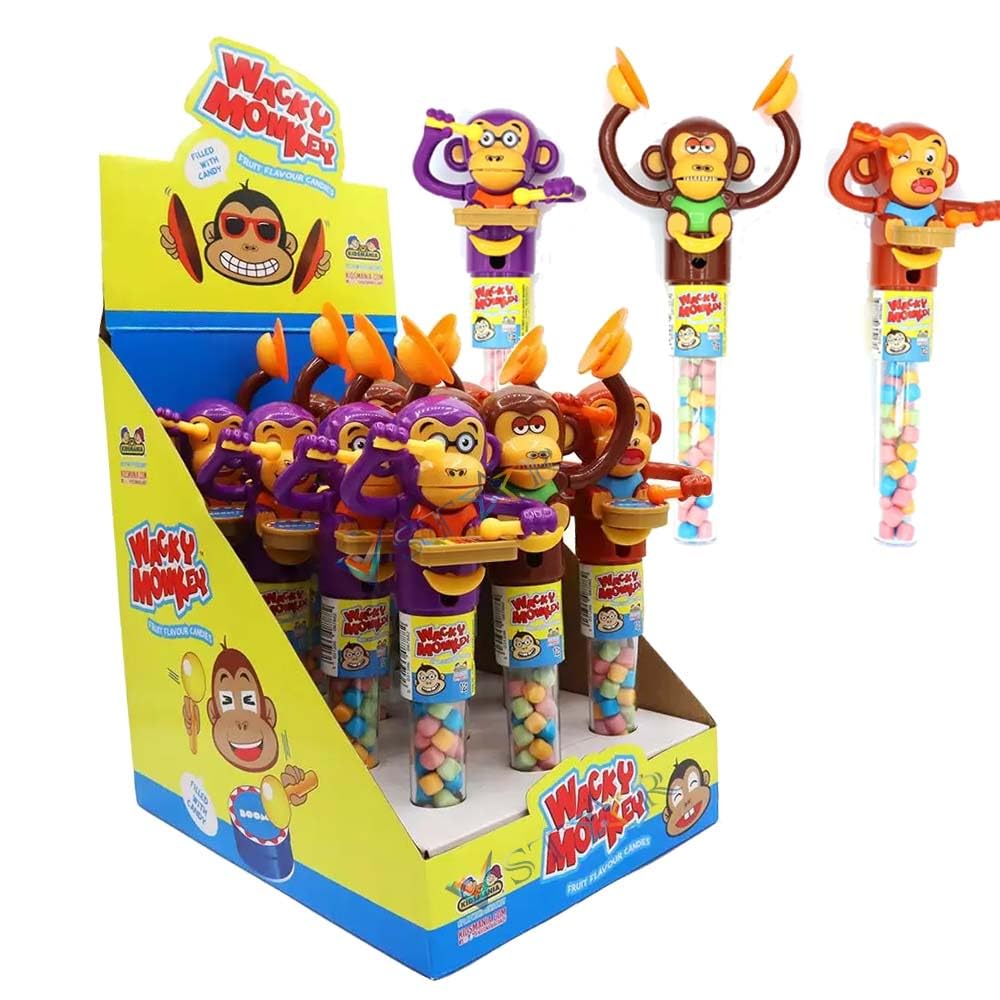 Perfect for kids gift. The best quality of product. 3 different monkeys to choose from. This Wacky Monkey will entertain you and let you have some delicious candy. Fruit flavoured candies. Wacky Fruit Flavour Dextrose Candy 3 Different Monkey, Pack of 12 x 12g.