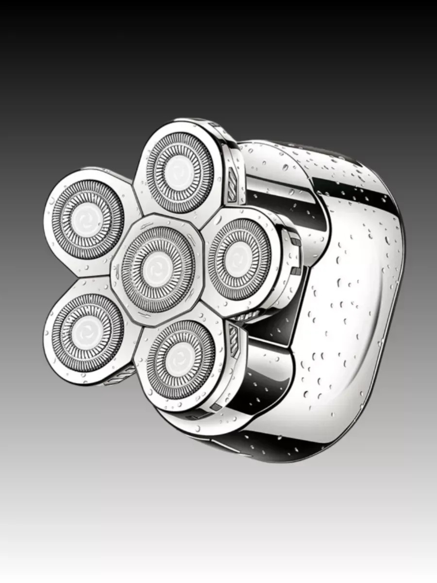 Электробритва — это беспроводная роторная бритва для сухого и влажного бритья. Она оснащена шестью бритвенными головками из нержавеющей стали и ЖК-дисплеем. Время работы от аккумулятора составляет 90 минут, а время зарядки — 2 часа. Бритва водонепроницаема (класс защиты IPX6) и может заряжаться через USB-порт.