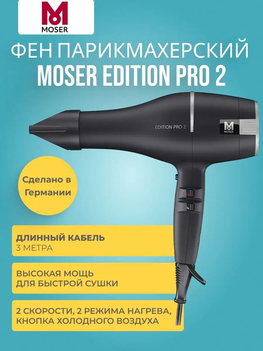 Профессиональный фен Moser Edition Pro 2 — высококачественный фен, произведённый в Италии, с эргономичным дизайном и сбалансированным распределением центра тяжести. Лёгкий вес и удобство в работе делают его идеальным инструментом для парикмахеров и стилистов. Скорость воздушного потока 150 км/ч и объём воздуха 92 м³/ч позволяют быстро и эффективно сушить волосы любой длины. Фен оснащён 3 температурными и 2 скоростными режимами, а также отдельной кнопкой подачи холодного воздуха, что даёт возможность подобрать оптимальные параметры для каждого типа волос и создавать идеальные укладки. Мощный мотор переменного тока обеспечивает стабильную и беспрерывную работу в течение всей смены. Потребляемая мощность — 2000 Вт. Длинный кабель 3 метра обеспечивает свободу движений, вес всего 485 грамм снижает нагрузку на руку. Цвет корпуса — чёрный. В комплекте идут две насадки системы Click&Turn, которые обеспечивают концентрированный и равномерный поток воздуха. Moser Edition Pro 2 — это профессиональный фен для салонов красоты, барбершопов и домашнего использования, сочетающий надёжность, производительность и комфорт.