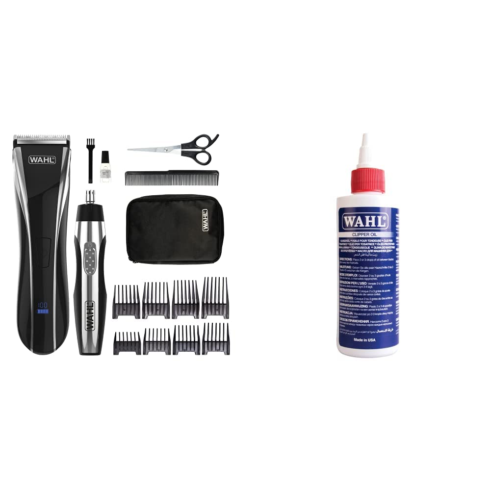 Wahl Ultimate Clipper, Hair Clippers for Men, Ultimate Clipper Head Shaver with Nose Hair Trimmer for Men, Personal Trimmers, Professional Quality, Cordless The Wahl Ultimate Clipper is a high-performance rechargeable clipper that is ideal for hair cutting. It can be used with or without the cord, offering freedom of movement with a 100-minute cordless run time. The 1-minute quick charge will give you 3 minutes continual use. Perfect to finish up if the charge runs out mid-cut. Equipped with an intelligent LCD battery indicator and worldwide voltage providing the flexibility to use this clipper wherever you are. We only use high precision blade grinding technology, ensuring the best cutting performance for you. Our blades offer superior performance, the finer the teeth the finer the quality. The blades on this clipper are detachable blades, meaning they are easy to clean and maintain optimal hygiene. The kit comes with eight attachment combs, a barber comb and scissors to create the perfect style in the comfort of your own home. Apply the finishing touches with the Spotlight personal trimmer that includes an integrated light so you will never miss any stray ear or nose hairs again. Wahl Clipper Oil, Blade Oil for Hair Clippers, Beard Trimmers and Shavers, Lubricating Oils for Clippers, Maintenance for Blades, Suitable for Hair Clipper and Trimmer Blades,Reduces Friction,118.3 ml Wahl Blade Oil is designed to help your clipper and trimmer blades run smoothly and prevent overheating from friction. Additionally, clipper oil will aid in prolonging the life of your blades and their cutting precision.