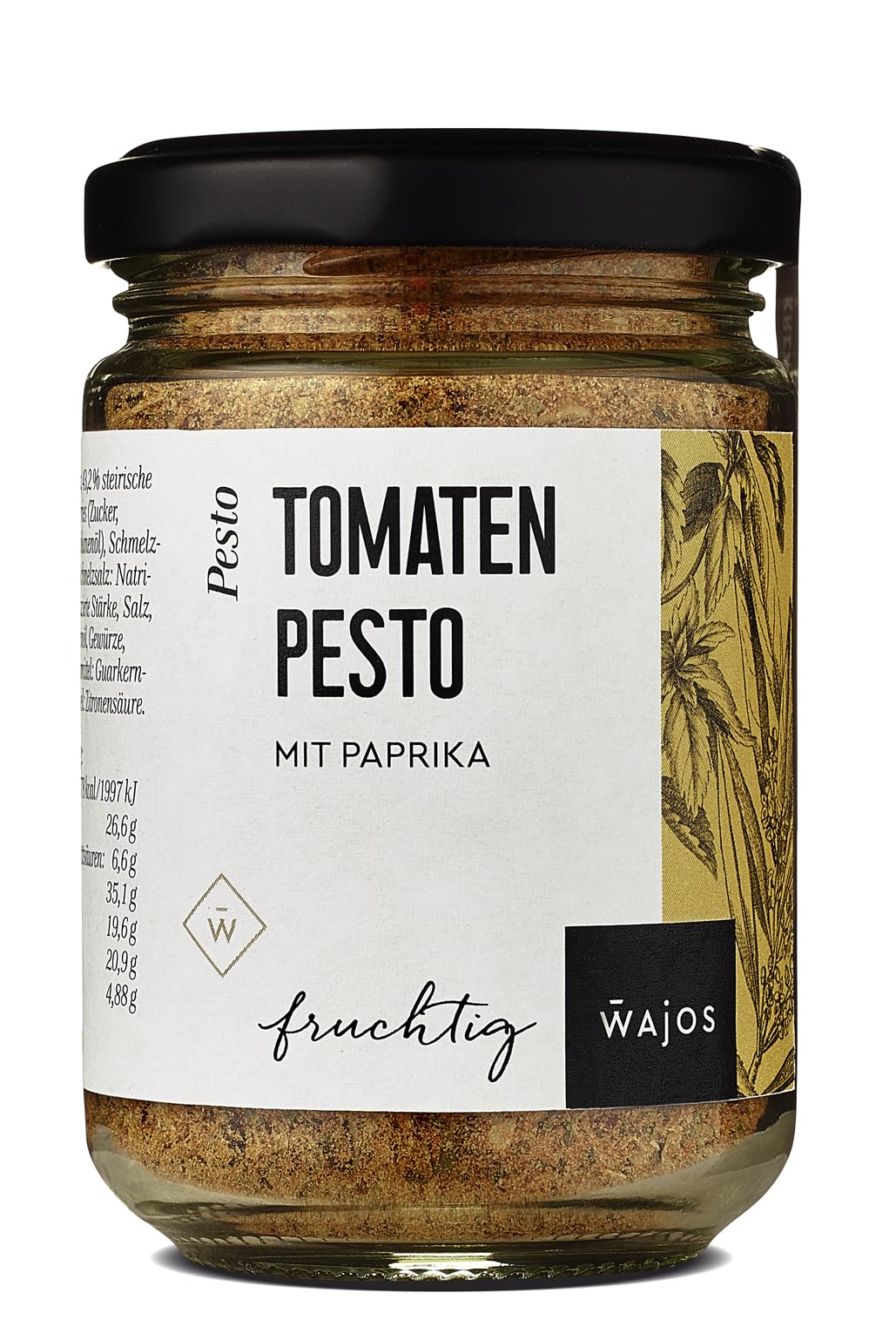 DESCRIPTION DU PRODUIT DESCRIPTION DU PRODUIT Le délicieux goût des tomates séchées, de l'huile d'olive et du basilic frais est parfaitement mis en valeur dans ce pesto. En plus de son utilisation typique comme sauce à pâtes, elle a également un goût de sauce pour les antipasti ou pour assaisonner les vinaigrettes et les marinades. Notre conseil : particulièrement délicieux pour les pommes de terre, le fromage de chèvre et le grillé. INGRÉDIENTS 38 de tomates, 15 de tomates séchées, crème (lait), 10 de noyau, 9 de marc de tomate, huile d'olive, beurre (lait), vinaigre balsamique (vinaigre de raisin concentré) (sulfite), sucre, épices, sel, épices, huile de tournesol.