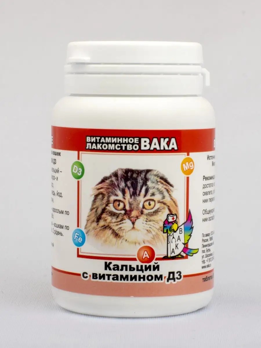 VAKA vitamins for cats with calcium and vitamin D3: Recommended for rickets, fractures, bone cracks, dislocations - to compensate for calcium deficiency - for skeletal and dental health - to strengthen the immune, reproductive and circulatory systems. Ingredients: vitamins A, C, group B, biotin, calcium - 0.15 g, vitamin D3 - 100 IU, macro- and microelements: magnesium, phosphorus, silicon, selenium, iron, zinc, copper, iodine. Application: prevention: kittens - 0.5 tablets 3 times a day, adult cats - 2 tablets 3 times a day. Therapeutic purposes: kittens - 1 tablet 2 times a day, adult cats - 3 tablets 3 times a day.