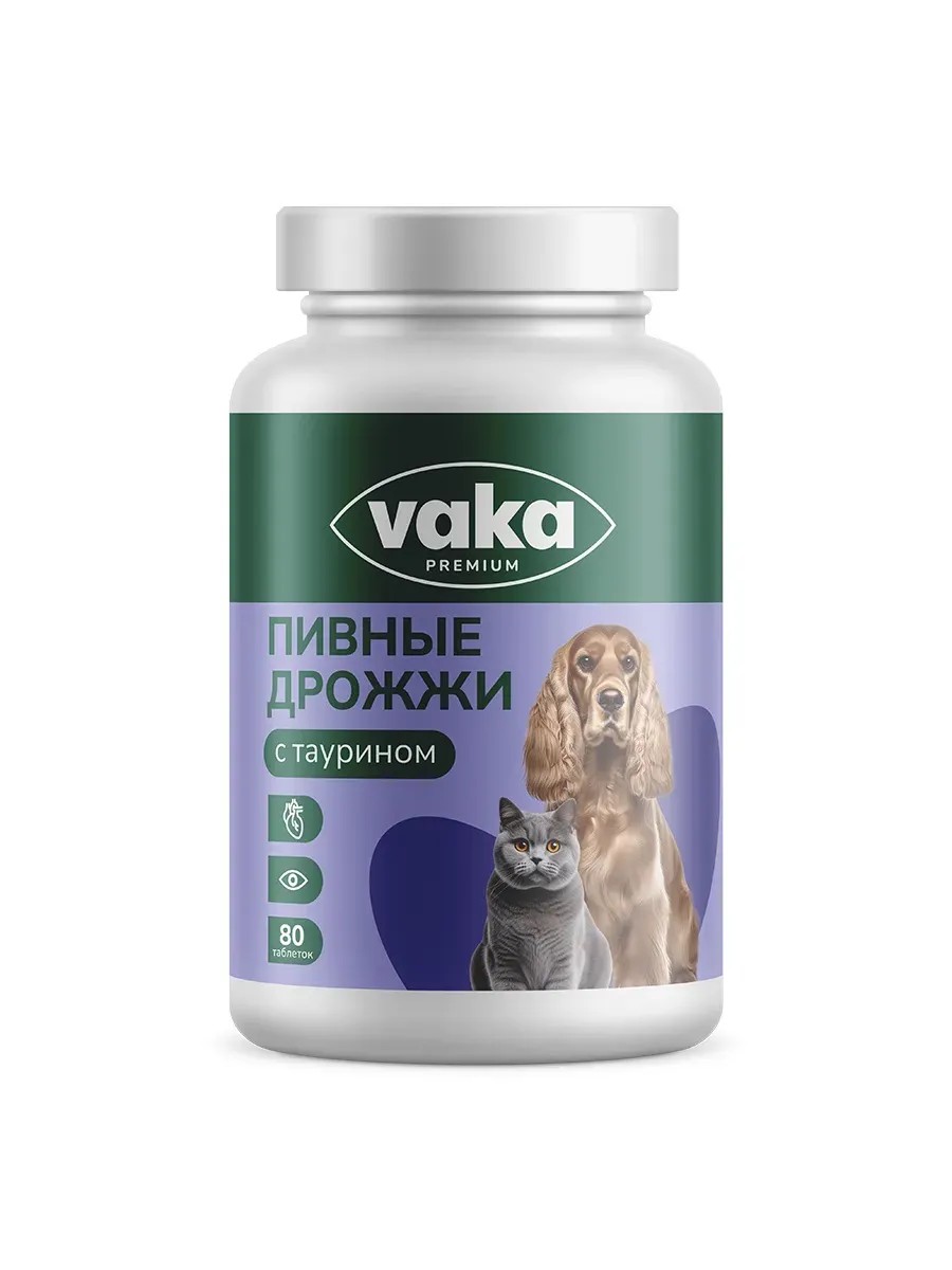 Taurine is essential for the normal functioning of the cardiovascular, nervous, and muscular systems. It is also crucial for good vision. Cats especially need taurine because it is not synthesized by the body. Therefore, it must be obtained as a supplement. It strengthens the heart muscle and prevents blood clots. It aids digestion (especially important for cats; they do not use other amino acids for this function). It prevents seizures and strengthens the immune system. Brewer's yeast - 60 mg, vitamin E - 600 mcg, taurine - 600 mcg, vitamin A - 200 mcg, vitamin B5 - 100 mcg, vitamin B2 - 80 mcg, vitamin B1 - 70 mcg, vitamin B6 - 60 mcg, vitamin PP - 50 mcg, vitamin B9 - 50 mcg, vitamin D3 - 55 IU, vitamin B12 - 1 mcg. Directions: puppies - 1 tablet 3 times a day, adult dogs - 2 tablets 3 times a day, kittens - 1 tablet 2 times a day, adult cats - 1 tablet 3 times a day. During pregnancy and lactation, the dose is doubled.