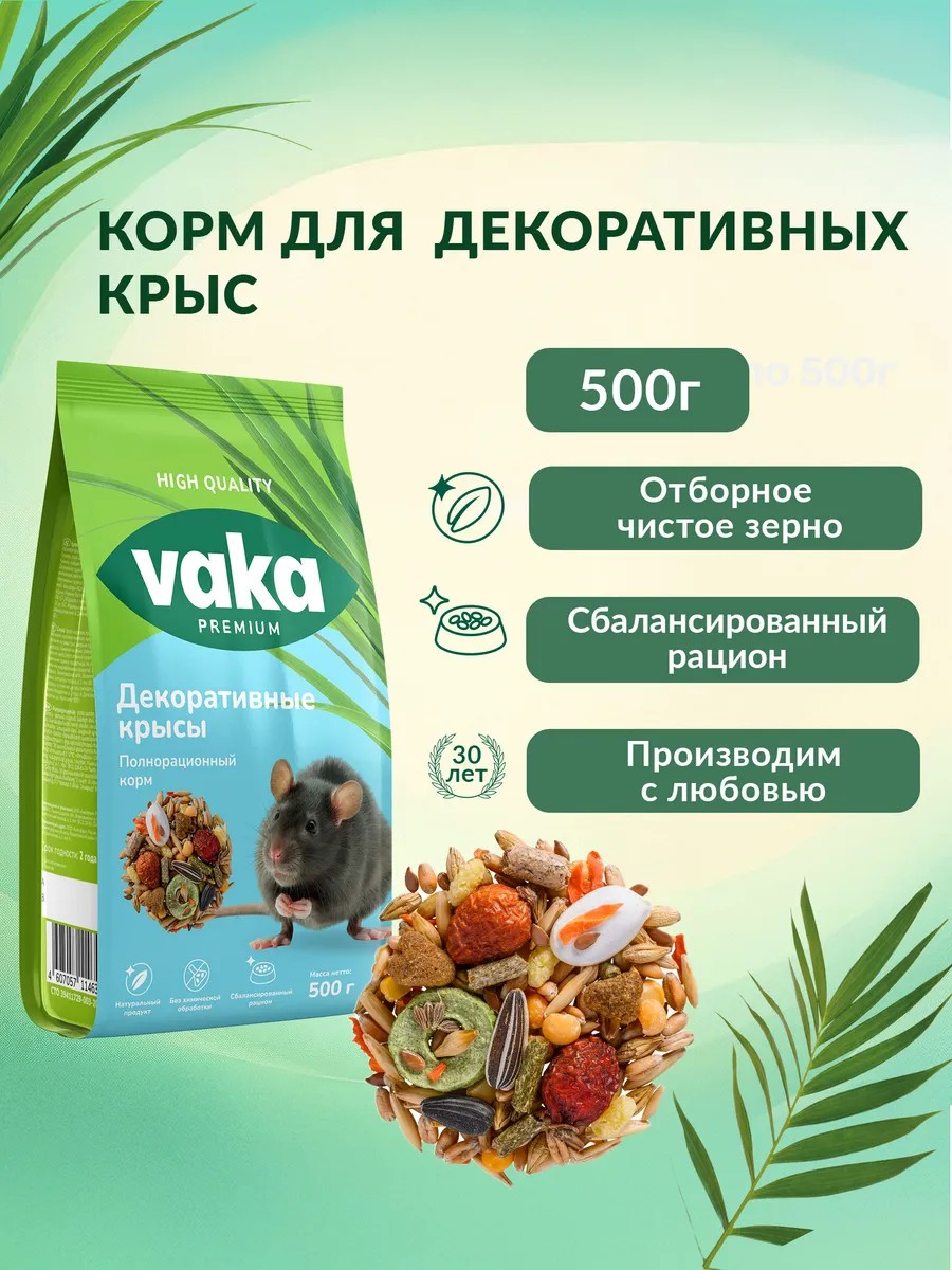 VAKA Premium food for decorative rats and mice is a balanced, multi-component diet suitable for pets of all ages.