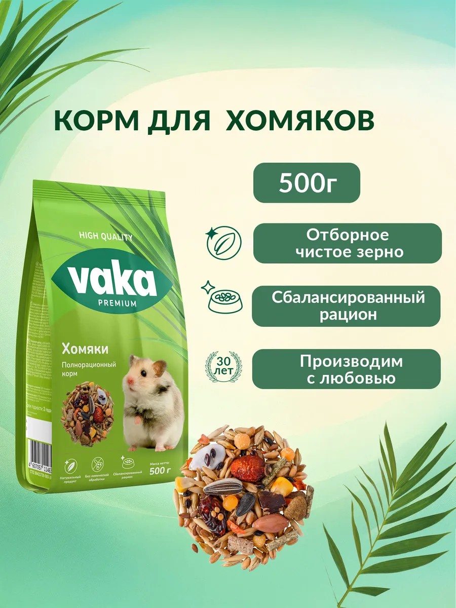 Корм VAKA Premium для хомяков — это сбалансированное питание, созданное с учётом всех потребностей этих маленьких питомцев. Подходит для хомяков всех возрастов и обладает множеством полезных свойств благодаря натуральным ингредиентам, которые поддерживают их здоровье и иммунитет.