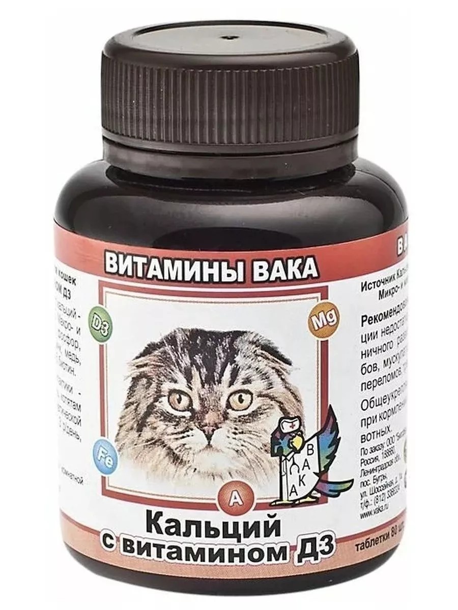 VAKA Vitamins for Cats with Calcium and Vitamin D3. Recommendations: for rickets, fractures, bone cracks, dislocations; to compensate for calcium deficiency; for skeletal and dental health; to strengthen the immune, reproductive and circulatory systems. Ingredients: vitamins A, C, group B, biotin, calcium - 0.15 g, vitamin D3 - 100 IU, macro- and microelements: magnesium, phosphorus, silicon, selenium, iron, zinc, copper, iodine. Application: prevention: kittens - 0.5 tablets 3 times a day, adult cats - 2 tablets 3 times a day. Therapeutic purposes: kittens - 1 tablet 2 times a day, adult cats - 3 tablets 3 times a day.