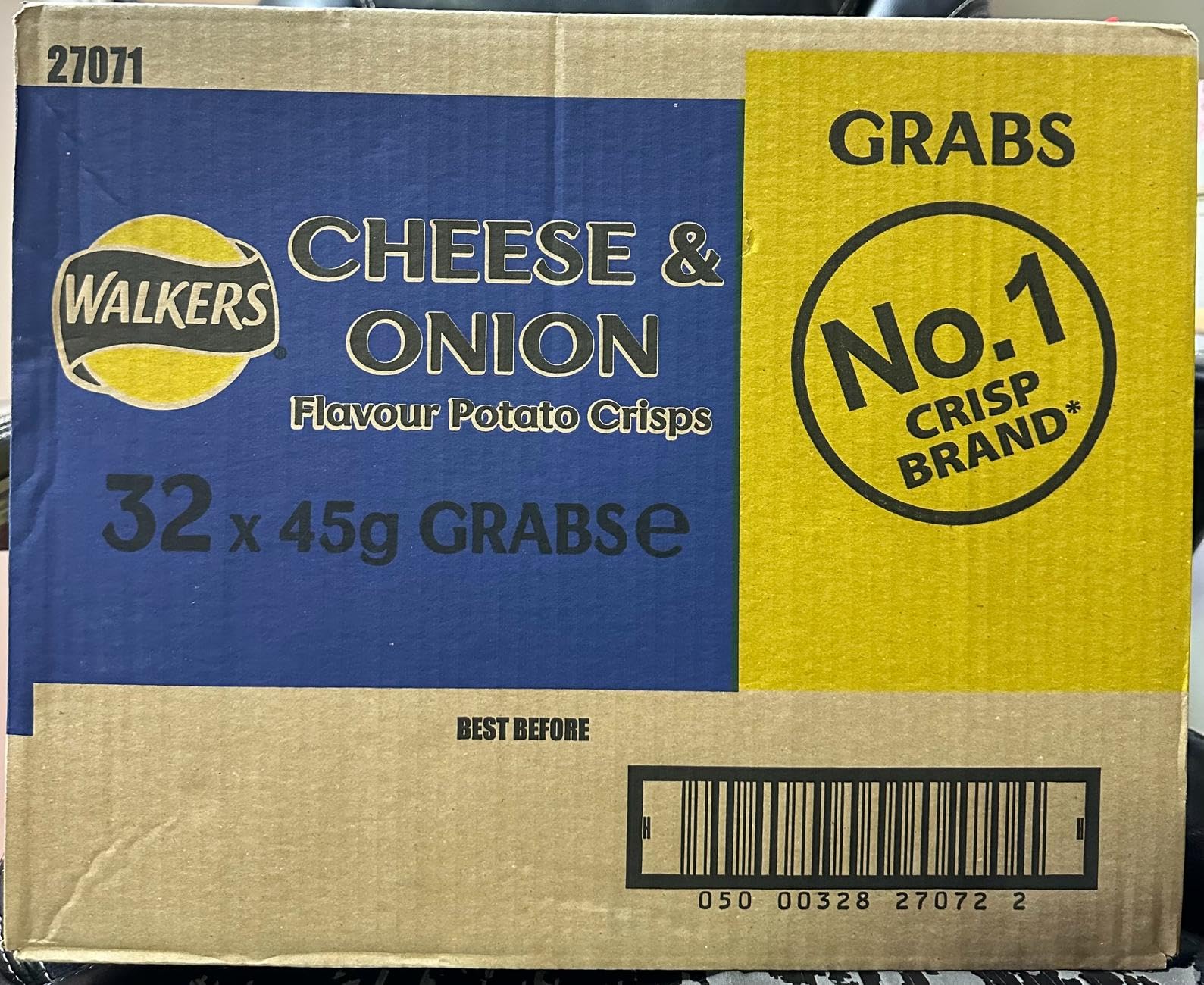Packiging May Vary. Stock up with the case of 32 for a ready supply of classic Cheese Onion goodness!. A timeless and iconic offering from Walkers, a trusted name in snacks. Conveniently packaged for freshness and portability. Versatile snack for on-the-go, lunchboxes, or sharing. Satisfying crunch for an enjoyable snacking experience. Crafted with the finest quality ingredients by Walkers. Classic and beloved flavor combination of rich cheese and tangy onion. Each pack is generously sized at 45 grams. Walkers Cheese Onion Crisps Case contains 32 individual packs.