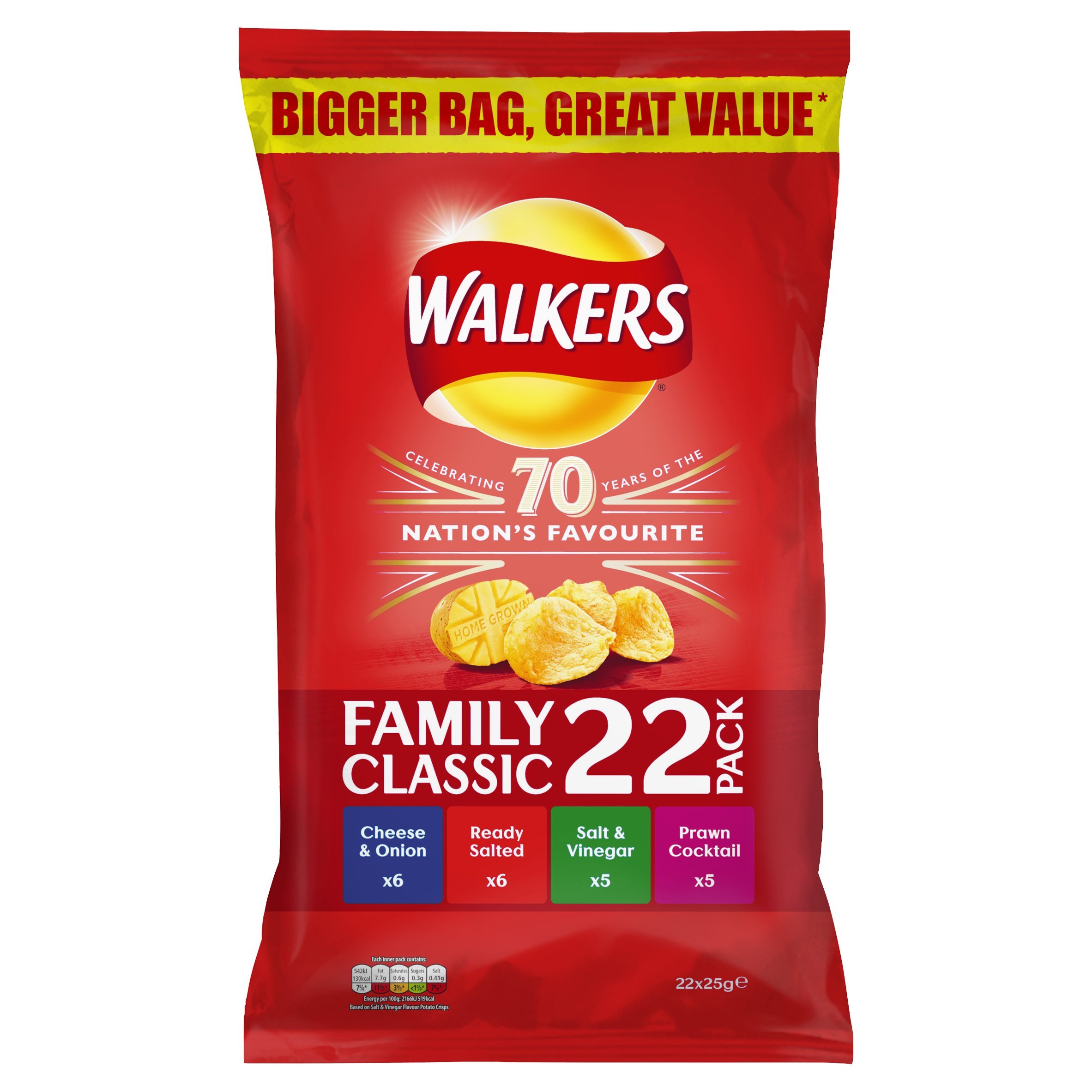 Walkers Classic Variety Crisps Family Pack 22 x 25 g INGREDIENTS Potato oils (sunflower, rapeseed chips, in different proportions), cheese and onion seasoning, logredients: potatoes, contains: whey permeate (from milk), salt, dried onion, sugar, ravers (contains cheese and onion powder), dried yeast, dried garlic, acids (citric. Help, malic acid), Cheesia Mik. lactose, milk. Color extract, Annatto). Potatoes, vegetable oils (sunflower, rapeseed, in different proportions), salt. Potatoes, vegetable oils (sunflower, rapeseed, in different proportions), salt and vinegar: seasoning. Salt and vinegar seasoning containing: flavoring, dried vinegar, salt, acid (citric acid), potassium chloride, sugar, potatoes, vegetable oils (sunflower, rapeseed, in different proportions), PRAWN Cocktail seasoning PRAWN Cocktail seasoning Contains: reviver, sugar, salt, glucose, acid (citric acid), potassium chloride, dried yeast. t, Dried Onini Tomato powder, color (paprika extract), sweetener (sucralose).Walkers Classic Variety Crisps Family Pack 22 x 25g 6 x Cheese Onion, 6 x Ready Salted, 5 x Salt Vinegar, 5 x Cocktail Prawns Guaranteed fresh taste 100 British potatoes with no artificial colours, preservatives or MSG. Walkers Classic Variety Crisps Family Pack 22 x 25 g INGRÉDIENTS Huiles de pommes de terre (tournesol, chips de colza, dans différentes proportions), assaisonnement fromage et oignon, logredients : pommes de terre, contient : perméate de lactosérum (à partir de lait), sel, oignon séché, sucre, raveurs (contient du fromage et de la poudre d'oignon), levure séchée, ail séché, acides (citrique. Aide, acide malique), Cheesia Mik. lactose, lait. Extrait de couleur, Annatto). Pommes de terre, huiles végétales (tournesol, colza, dans différentes proportions), sel. Pommes de terre, huiles végétales (tournesol, colza, dans différentes proportions), sel et vinaigre : assaisonnement. Assaisonnement sel et vinaigre contenant : arôme, vinaigre séché, sel, acide (acide citrique), chlorure de potassium, sucre, pommes de terre, huiles végétales (tournesol, colza, dans différentes proportions), assaisonnement PRAWN Cocktail Assaisonnement PRAWN Cocktail Contient : ravivant, sucre, sel, glucose, acide (acide citrique), chlorure de potassium, levure séchée. t, Onini séché Poudre de tomate, couleur (extrait de paprika), édulcorant (sucralose).Walkers Classic Variety Crisps Family Pack 22 x 25 g 6 fromages et oignons, 6 x salés prêts, 5 x sel et vinaigre, 5 x crevettes Cocktail goût frais garanti 100 pommes de terre britanniques sans colorants artificiels, conservateurs ou MSG.