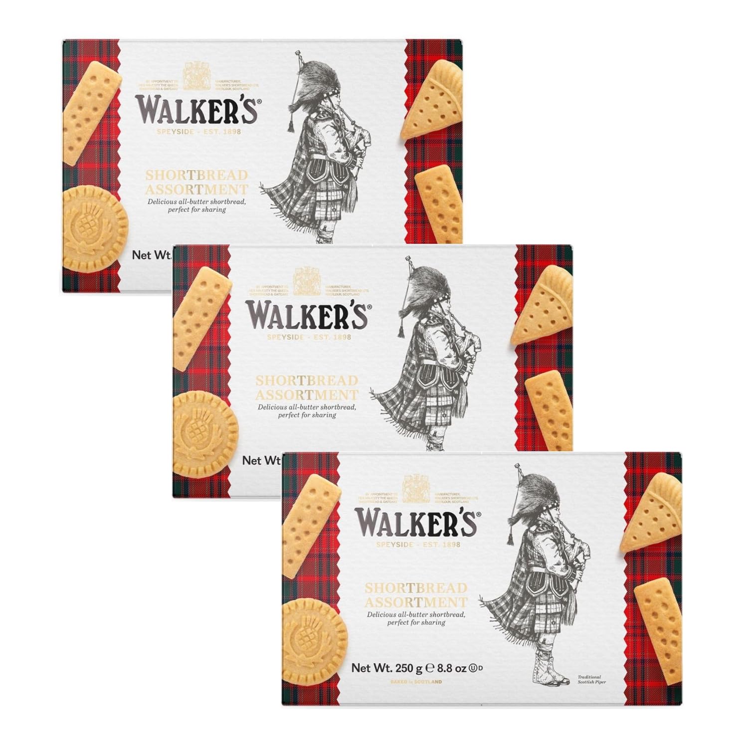 Walker's story begins in 1898 when Joseph Walker opened his bakery with a 50 loan and the ambition to bake the finest, best-tasting shortbread in the world. During his first year in business, Joseph used every spare moment to perfect his shortbread recipe. It was time well spent. Soon, shooting parties from the local costume party began making short detours to visit Joseph's bakery. As word spread, demand for his quality shortbread grew rapidly, and Joseph took the first steps to expand his business, moving his largest shop to the Speyside village of Aberlour and investing in a horse and cart to deliver to his customers even further afield. Walker's Pure Butter Assorted Shortbread: 3 x 250g – Pure butter assorted biscuits. Made in Scotland. [Scottish Butter] - These classic English butter biscuits come in a convenient tin divided into a blister pack inside. They're perfect for enjoying with afternoon tea, with friends, for breakfast, or as a treat for a relaxing coffee break. [Shortbread] - A Scottish biscuit, traditionally made with one part sugar, two parts butter, and three parts flour, with the possible addition of other ingredients. The name shortbread refers to the characteristic crumbly texture of this type of biscuit. [CLASSIC TASTE] - Only by baking in small batches does Walkers guarantee the classic taste that distinguishes their biscuits. Frollini are made exclusively with flour, butter, sugar, and salt, using the same recipe originally created by Joseph Walker. [The Choice] - The range is rich in Scottish character with many assorted treats, and Walkers biscuits come in a variety of shapes and varieties: round, triangular, and oblong. They are packaged in convenient tins or in delightful collectible metal cans. [THE BRAND] - The tradition of fine baking, begun by Joseph, has been passed down through generations, a fact guaranteed by the brand name on every package. Our products are made exclusively with the finest ingredients, chosen for their quality and natural goodness. INGREDIENTS Wheat flour (wheat flour, calcium carbonate, iron, niacin, thiamine), butter (milk) 32 , sugar, salt. May contain nuts.Walkers Biscuits Beurre Boîte Cadeau Biscuits Beurre Écossais Trousse à Biscuits Boîte Cadeau Pâtisserie Anglais Pur Beurre - 3 x 250 GrDESCRIPTION DU PRODUIT DESCRIPTION DU PRODUIT Walker L'histoire commence en 1898, lorsque Joseph Walker a ouvert les portes de sa boulangerie avec un prêt de 50 et l'ambition de cuire la plus belle et bonne pâte folle du monde. Au cours de la première année d'activité, Joseph a utilisé chaque moment de pause pour perfectionner sa recette de pâte sablée. C'était du temps bien passé. Bientôt, les partis de tir des tenues locales ont commencé à faire des déviations courtes pour visiter la boulangerie de Joseph. Avec la diffusion du mot, la demande pour sa pâte sablée de qualité a augmenté rapidement et Joseph a pris les premiers pas pour étendre son entreprise, en déplaçant son plus grand mag dans le village Speyside d'Aberlour et en investissant dans un cheval et un chariot pour livrer sa foule encore plus loin. « Walkers Pure Butter Assorted Shortbread » : 3 x 250 g – Biscuits assortis pur beurre. Fabriqué en Écosse. [Beurre écossais] - Les biscuits typiques au beurre anglais se présentent dans une boîte pratique divisée en un blister à l'intérieur. Ils sont parfaits à déguster avec le thé de l'après-midi, en compagnie d'amis, pour le petit déjeuner ou à offrir pour une pause douce détente café. [Le Shortbread] – Biscuit écossais, traditionnellement préparé avec une partie de sucre, deux de beurre et trois de farine, avec l'ajout éventuel d'autres ingrédients. Le nom shortbread se réfère à la friabilité particulière de ce type de biscuits. [GOÛT CLASSIQUE] - Seulement en cuisant en petits lots Walkers garantit ce goût classique qui distingue leurs biscuits. Frollini fabriqués exclusivement avec de la farine, du beurre, du sucre et du sel, en utilisant la même recette qu'une fois conçue par Joseph Walker. [Le choix] - La gamme est riche en caractère écossais avec de nombreuses friandises assorties et en plus les biscuits Walkers ont de nombreuses variétés et formes au choix : ronds, triangles, allongées. Ils sont emballés dans des boîtes pratiques ou dans de délicieuses canettes en métal de collection. [LA MARQUE] - La tradition de la haute boulangerie commencée par Joseph est portée depuis des générations et cela est également garanti par la marque apposée dans chaque paquet. Les produits sont fabriqués uniquement avec les meilleurs ingrédients obtenus en faveur de la qualité et de la bonté naturelle. INGRÉDIENTS Farine de blé (farine de blé, carbonate de calcium, fer, niacine, thiamine), beurre (lait) 32 , sucre, sel. Peut contenir des fruits à coquille.