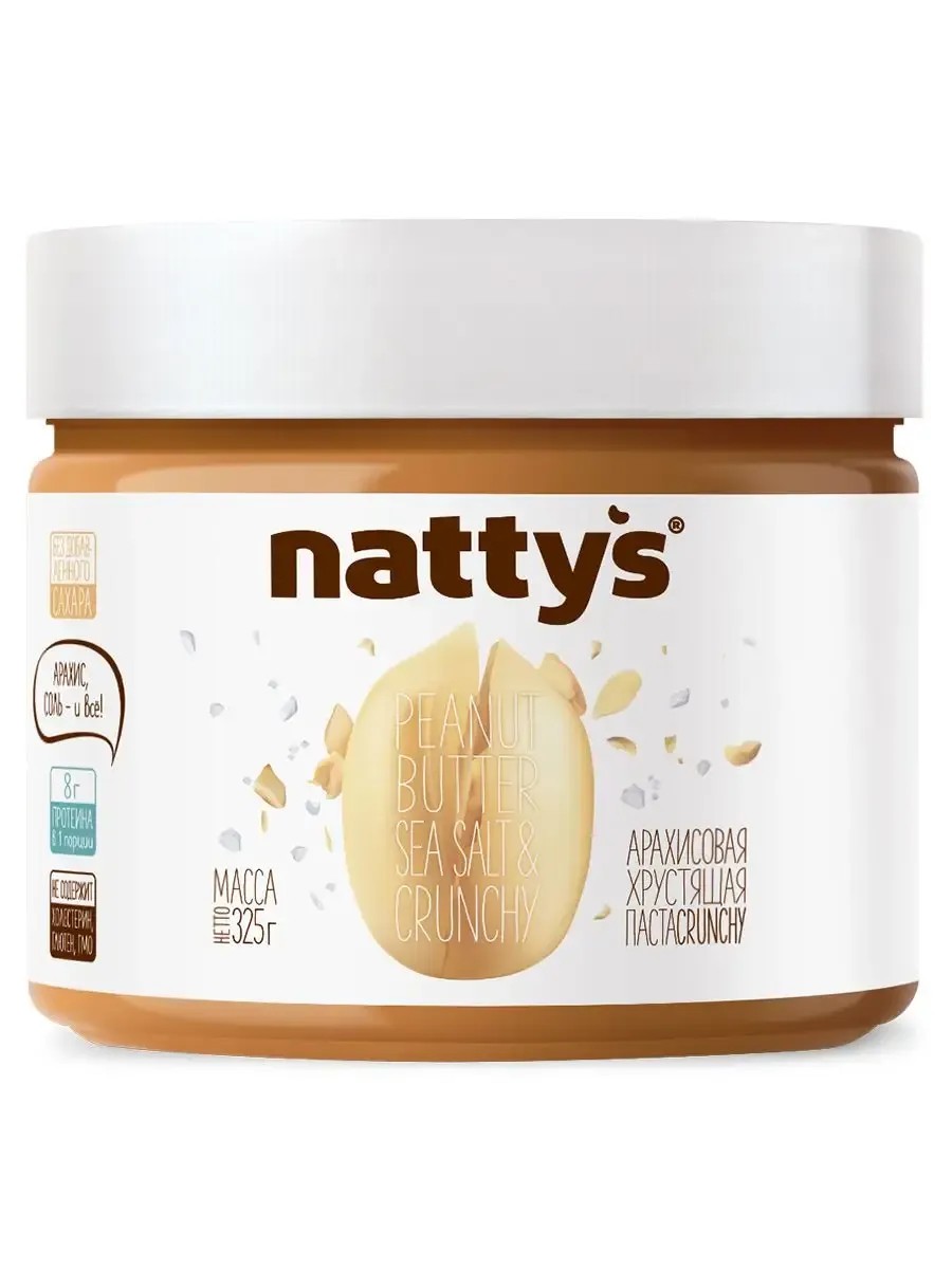 Nattys Sea Salt & Crunchy — это та самая солёно-сладкая арахисовая паста, абсолютно натуральная, приготовленная по особому рецепту, без добавления сахара, с чистым составом и самым любимым вкусом! Продукты Nattys производятся по бережной технологии сохранения всех полезных свойств ореха, без добавления искусственных добавок, из премиальных ингредиентов высшего качества. Настоящая еда для нового тебя! Да, арахисовая паста очень популярна в США, и целые поколения выросли на сэндвичах PB & Jelly: помните, как в фильмах, на кухне всегда стоит баночка арахисовой пасты Peanut Butter и как родители, собирая детей в школу, кладут им в ланч бокс бутерброд с арахисовой пастой и джемом? Арахисовая паста является неотъемлемой частью рациона школьников, спортсменов и космонавтов NASA! Потому что это натуральный источник белка и очень вкусный и питательный десерт. А еще в Америке очень любят есть арахисовую пасту ложкой! Это очень вкусно! Попробуйте! А мы в Nattys сделали пасту непросто очень вкусной, мы сделали её ещё и полезной: подходит для правильного питания, пп диет, поста, для вегетарианцев и КЕТО (keto) диеты. Без сахара, без глютена, без ГМО, без пальмового масла. Арахисовая паста Nattys — это полезная сладость, натуральный и вкусный десерт, который содержит легкоусваиваемые медленные углеводы и растительные жиры, клетчатку и полезные калории, которые придают энергии на длительное время, а чувство сытости блокирует потребность в постоянных перекусах и тем самым способствуют похудению и поддержанию фигуры. Правильные калории обеспечивают человека энергией: женщинам нужно около 2 тыс. калорий в день, а мужчинам — около 2,5 тыс. Добавьте арахисовую пасту в кашу, намажьте на свежий хрустящий хлеб или на банан — это настоящее удовольствие! Мы не используем классические технологии обжарки орехов: мы термически обрабатываем орехи при щадящих температурах, что позволяет нам производить бережную обработку с сохранением всех полезных свойств ореха. И получить по-настоящему естественно сладкий и ароматный орех, который превращается в баночку вкусной пасты Nattys.