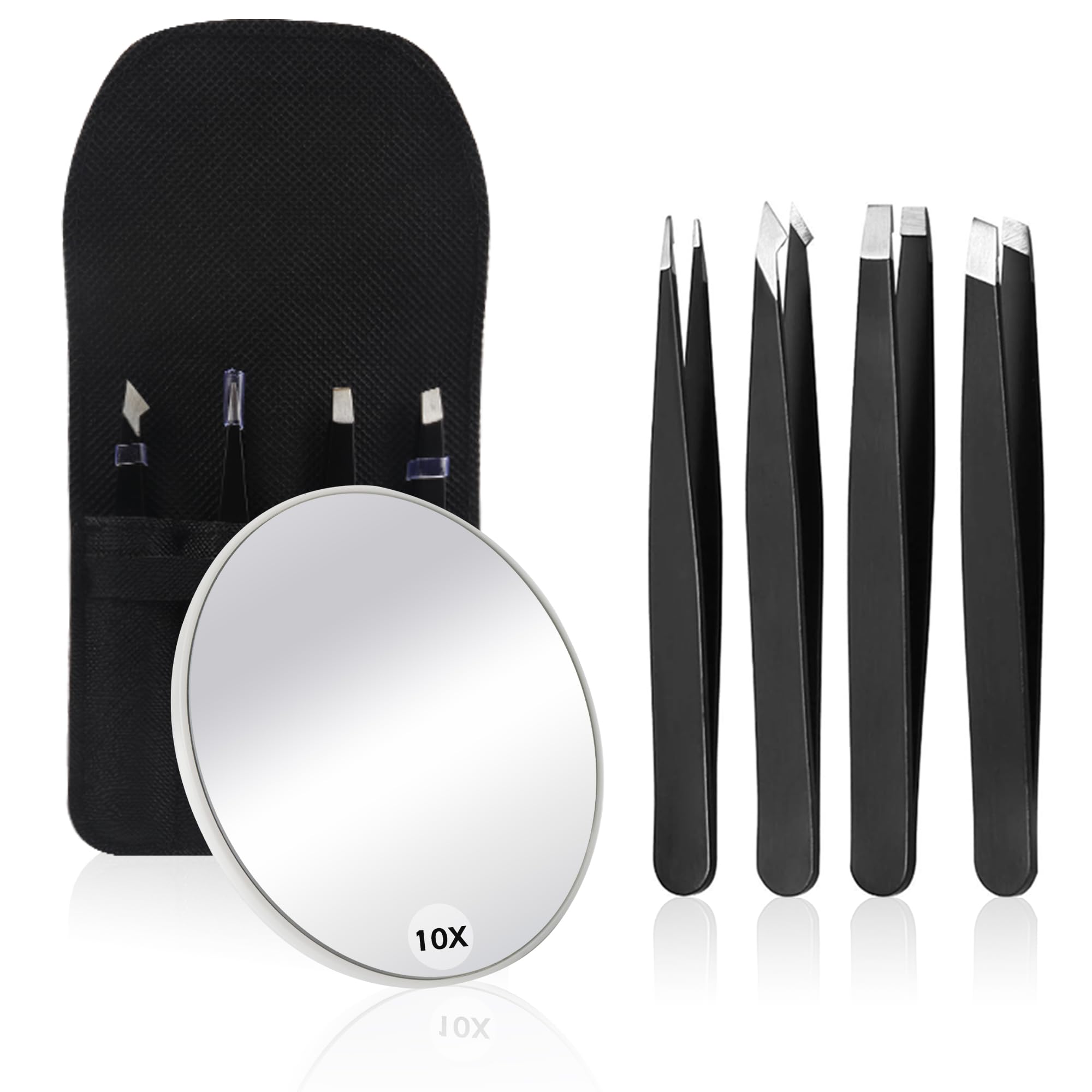 Multi-use: Tweezers with different tips remove hair from different parts of the body. Flat tip tweezers can be useful for removing hair from the eyebrows. Slant tip can be used for removing hair on the skin that often comes with a curve. Pointed tipped tweezers can be useful for removing ingrown hair, angle tipped tweezers can can remove hair from the triangular area of the lower part of the eyelid. It also can be used to remove hair from other parts of the body, without harm to the skin Our 10x travel mirror is only 3.3 inches palm size, 0.35 inches thickness, which is a perfect size. It can be used indoors or easily placed in your bag for outdoor use.?Ideal for Travel or Gift?- WangSelect's Tweezers and 10X Magnifying Mirrors are perfect for touch-ups on the go, making them an excellent choice for gift giving or travel. PS: Due to the nature of the magnifying mirror, please keep mirror 2-3 inches away from your eyes for a clear viewing. Otherwise, the image will appear distorted, blurred, reversed, etc. 100 risk-free purchase. Please feel free to contact us. ?A Perfect Combination for Makeup?- Our tweezers set providing effective facial hair removal solutions for various facial areas. Accessible for facial details through with this magnifying magnetic mirror, convenient to refine the facial hair and makeup carefully. The tweezers are small in size and lightweight, combined in a fine travel leather holster and portable to carry without falling out or losing them. ?Easy For Remove Hair?- This eyebrow plucking tweezers has precision-aligned tips and calibrated arm tension. You can hold each fine hair tightly and pull out the whole root without breaking it. The sharp tweezers can reduce the pain and easy to griping and removing chaotic eyebrows hair, ingrown hair, facial nose hair or all unwanted body hair. ?Portable 10X Magnifying Mirrors?- The 10X magnifying mirror can amplify all details on the face. More than ever, the pores are clearly visible. Ideal for eyebrow trimming, plucking, makeup, shaving, flossing or wearing contact lenses etc. This magnifying mirror contains magnetism, you can install it quickly and attach it to any flat metal surface. Free your hands for makeup. ?Professional Precision Tweezers? - WangSelect' tweezers set including a pair of classic flat, slant, pointed, and pointed slant tweezers. This durable tweezers set is made of high quality stainless steel which is long-lasting strength and easy to clean. Designed for both women and men to meet their eyebrow shaping routine.