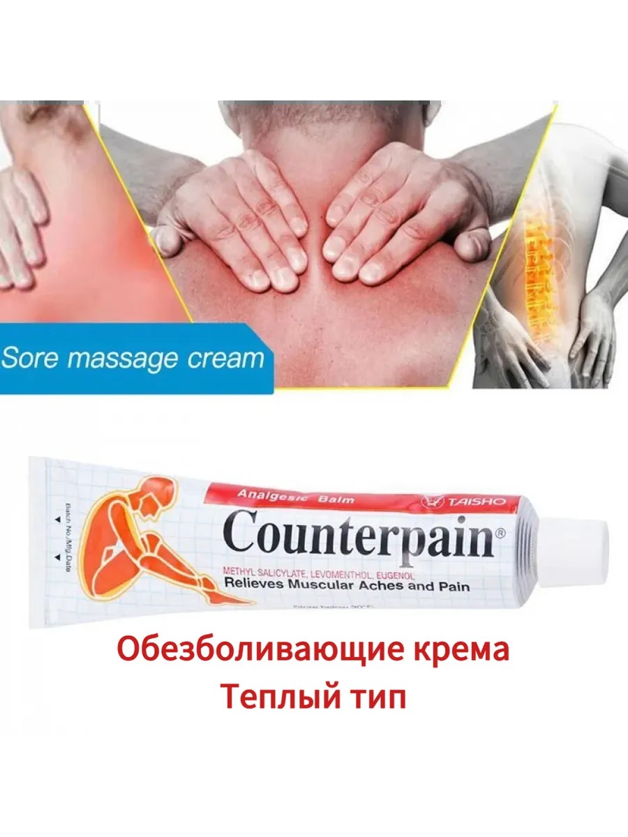 Активное вещество :Метилсалицилат 10,2%Эвгенол 1,36%Ментол 5,44%Направления:Нанесите обезболивающий крем Counterpain на пораженный участок. Почувствуйте тепло его ингредиентов, которые помогают облегчить боль и скованность мышц. Хорошо потрите пораженный участок. Повторяйте 3–4 раза в день. Для детей до 2 лет проконсультируйтесь с врачом.Избегать :Только для наружного применения.Не принимать внутрь и в глаза.Храните в недоступном для детей месте.Функции:Спортивный натиратель при болях в мышцах и перенапряжении. Особая эффективность облегчает мышечные боли.Обеспечивает успокаивающее облегчение при болях, вызванных: перенапряжением, болями в спине, скованностью, болью в суставах, артритом, растяжениями.В комплект входит: мазь от артрита, 1 шт.