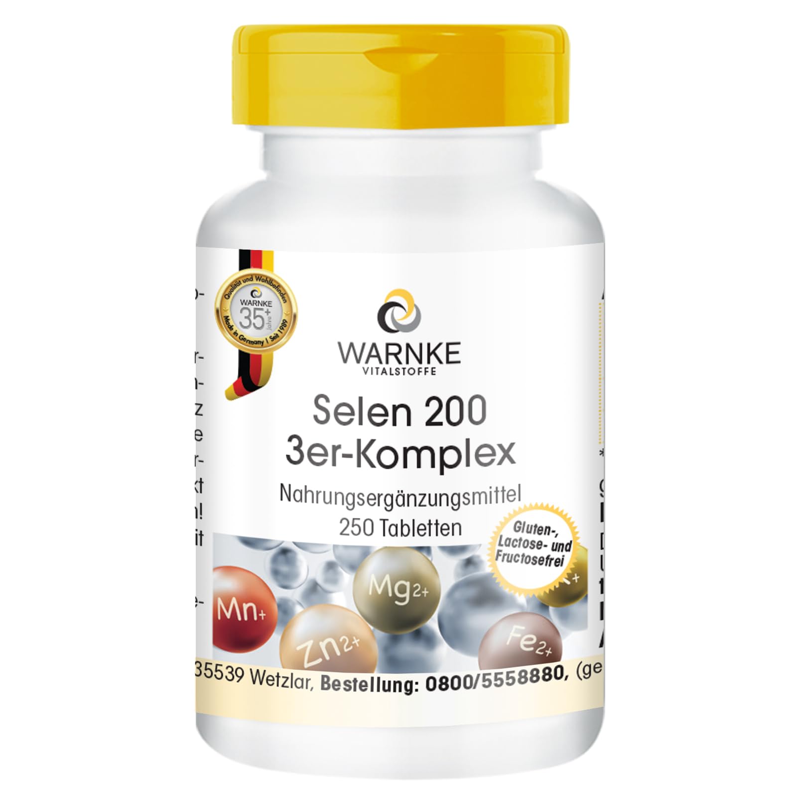 Selenium 3-complex tablets from Warnke Vitalstoffe Gluten-free, lactose-free, fructose-free Recommended intake: Adults take 1 tablet per day with a meal and sufficient water. Contents per tablet RI : Selenium (selenium yeast) 67 µg 122 mg Selenium (selenomethionine) 67 µg 122 mg Selenium (sodium selenite) 66 µg 120 mg Ingredients: Bulking agent: microcrystalline cellulose, selenium yeast, selenomethionine, sodium selenite 250 tablets with a high dose of selenium-3 complex, for more than 8 months. INGREDIENTS Filler microcrystalline cellulose, Selenium yeast, Selenomethionine, Sodium seleniteQuality and user-friendliness: Our products meet HACCP quality standards. Made in Germany. Raw materials from EU and non-EU countries. The optimized packaging with a sealed dosing cap guarantees a long shelf life of your nutritional supplements and easy dosing. Contents: 250 high-dose selenium triple complex tablets. Recommended dosage: Adults take 1 tablet per day with a meal and plenty of water. Ingredients: Bulking agent: microcrystalline cellulose, selenium yeast, selenomethionine, sodium selenite. Excellent value for money from Warnke Vitalstoffe: High-dose selenium triple complex tablets with 67 µg selenium from selenium yeast, 67 µg selenium from selenomethionine and 66 µg selenium from sodium selenite per tablet. More than 30 years of expertise in vital substances! High dosage and excellent bioavailability!. Beauty Essential Complex: The selenium-3 complex combines three high-quality selenium sources: selenium yeast as a natural source, selenomethionine and sodium selenite. Selenium contributes to the maintenance of normal hair and nails. Selenium contributes to the normal functioning of the immune system, normal spermatogenesis and thyroid function, and the protection of cells against oxidative stress.Selenium 3-complex - 250 tabletten, elk 200 µg bevattend - Complex van seleniumgist, selenomethionine en natriumseleniet - HOGE DOSERING - Duitse apotheekkwaliteit - veganistisch Warnke Vitalstoffe Selenium 3-complex tabletten van Warnke Vitalstoffe Glutenvrij, lactosevrij, fructosevrij Aanbevolen inname: Volwassenen nemen 1 tablet per dag bij een maaltijd met voldoende water. Inhoud per tablet RI : Selenium (seleniumgist) 67 µg 122 mg Selenium (selenomethionine) 67 µg 122 mg Selenium (natriumseleniet) 66 µg 120 mg Ingrediënten: Vulstof: microkristallijne cellulose, seleniumgist, selenomethionine, natriumseleniet 250 tabletten met een hoge dosering selenium-3-complex, gedurende meer dan 8 maanden. INGREDIËNTEN Vulstof microkristallijne cellulose, Selenium gist, Selenomethionine, NatriumselenietKwaliteit en gebruiksvriendelijkheid: Onze producten voldoen aan de HACCP-kwaliteitsnormen. Gemaakt in Duitsland. Grondstoffen uit EU- en niet-EU-landen. De geoptimaliseerde verpakking met een verzegelde doseerdop garandeert een lange houdbaarheid van uw voedingssupplementen en een eenvoudige dosering. Inhoud: 250 hooggedoseerde selenium-triple-complextabletten. Aanbevolen dosering: Volwassenen nemen 1 tablet per dag bij een maaltijd met voldoende water. Ingrediënten: Vulstof: microkristallijne cellulose, seleniumgist, selenomethionine, natriumseleniet. Uitstekende prijs-kwaliteitverhouding van Warnke Vitalstoffe: Hooggedoseerde selenium-triple-complextabletten met 67 µg selenium uit seleniumgist, 67 µg selenium uit selenomethionine en 66 µg selenium uit natriumseleniet per tablet. Meer dan 30 jaar expertise in vitale stoffen! Hoge dosering en uitstekende biologische beschikbaarheid!. Beauty Essential Complex: Het selenium-3-complex combineert drie hoogwaardige seleniumbronnen: seleniumgist als natuurlijke bron, selenomethionine en natriumseleniet. Selenium draagt bij aan het behoud van normaal haar en normale nagels. Selenium draagt bij aan de normale werking van het immuunsysteem, een normale spermatogenese en schildklierfunctie, en de bescherming van cellen tegen oxidatieve stress.