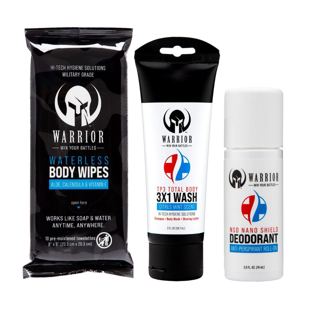 GENTLEON SENSITIVE SKIN: Our body wipes are specially formulated to be pH-balanced and hypoallergenic, ensuring they are safe and gentle on sensitive skin. These body cleaning wipes help prevent skin irritation and are ideal for those with delicate skin conditions. Each of these wet wipes is pre-moistened to ensure your skin is not just clean but also moisturized. Our bathing wipes easily remove sweat and dirt from the body and face, working just like soap and water without. RINSE-FREE CLEANSING WIPES: Enjoy the ease of waterless cleansing with our thick, ultra soft washcloths wipes, perfect for on-the-go hygiene and cleaning. Ideal for camping, traveling, gym, and after workout activities, as well as outdoor activities where soap and water aren't available. Feel clean and refreshed without having to get into a tub or shower. MILITARY-GRADE DEODORANT: Our antiperspirant deodorant is developed with advanced nano shield technology to provide powerful protection against sweat and odor for up to 48 hours. This military-grade formulation ensures long-lasting freshness, even under the most demanding conditions. 3 IN 1 MULTI-PURPOSE SOAP: This versatile shower body wash combines a body wash, shampoo, and shaving lather in one convenient bottle. It's perfect for simplifying your grooming routine and is ideal for use at home, after gym, or during travel. Experience the convenience of a single product that caters to all your hygiene needs. PROUDLY MADE IN USA: Warrior's TP3 Total Body Wash 3 in 1 is made with the highest quality standards right here in the USA, ensuring you receive a reliable and effective product every time. This all-in-one solution proudly supports local manufacturing, guaranteeing top-tier quality and performance.