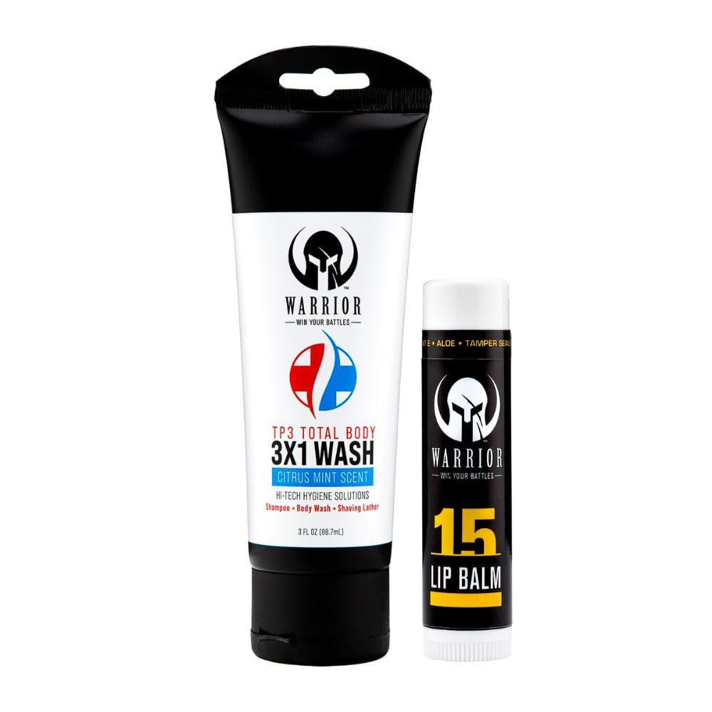 MILITARY-GRADE: Trusted and used by military personnel around the world, this lip balm with sunscreen offers unmatched performance in extreme conditions. Its robust formulation meets the demanding needs of those serving in diverse climates. ALL-WEATHER DEFENSE: Our sunscreen lip balm provides reliable defense against harsh environmental conditions, including wind, cold, and heat. The purified beeswax formulation keeps your lips moisturized and protected in all-weather scenarios. CITRUS MINT SCENT: Infused with a refreshing citrus mint scent, our 3 in 1 body wash refreshes your senses while leaving your skin and hair feeling clean and revitalized. The pleasant aroma provides a lasting freshness that enhances your overall grooming experience. 3 IN 1 MULTI-PURPOSE SOAP: This versatile shower body wash combines a body wash, shampoo, and shaving lather in one convenient bottle. It's perfect for simplifying your grooming routine and is ideal for use at home, after gym, or during travel. Experience the convenience of a single product that caters to all your hygiene needs. PROUDLY MADE IN USA: Warrior's TP3 Total Body Wash 3 in 1 is made with the highest quality standards right here in the USA, ensuring you receive a reliable and effective product every time. This all-in-one solution proudly supports local manufacturing, guaranteeing top-tier quality and performance.