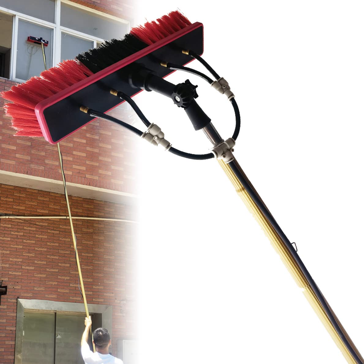 he floor is too high, how to clean the windows, it is not safe to climb the ladder, and the cleaners are too expensive. Well, this cleaning brush can help you get from the ground to your windows faster and safer than ever. It is a fully expandable water spray cleaning system that can be connected to a pure water system or a garden hose. Product parameters: Product name: Telescopic window cleaning rod Material: High density aluminum alloy Surface: Electrophoresis Process Mother tube diameter: 2.9 cm Sub-pipe diameter: 2.6 cm Single pole net weight: 0.25 kg Fields of use: window cleaning, photovoltaic panel cleaning, bus exterior cleaning, large vehicles, trucks, caravans, ships, etc. Packing list: 1 Telescopic pole 1 Water Brush 1 Water collector 1 water pipe 1 Faucet Connector 1 Universal joint Service: If you have any questions, please send us an email and we will reply and serve you within 24 hours. See moreEasy to InstallThe retractable cleaning brush can be attached freely, and the steel buckle is fixed for a perfect closure. Wide range of applications: Suitable for cleaning windows at heights, solar photovoltaic panels, cleaning cars, trucks, vans, caravans, windows, greenhouses, boats, decks, etc. CONVENIENT WATER SUPPLY: Our custom water supply pole is fun and easy to use, just connect to any standard household water source, turn on the faucet and you can clean windows, conservatories, frieze and soffit time. otate 180 : The brush head is made of soft PP fiber and can be rotated 180 with a flexible swivel locking mechanism. As a result, it conforms to corners and conforms to contours, removing hard-to-reach dirt, grime and grease from uneven surfaces while keeping the surface scratch-free. Material: The water inlet retractable cleaning brush is made of strong and lightweight aviation aluminum. Very durable and soft feather bristles ensure a safe and clean surface.