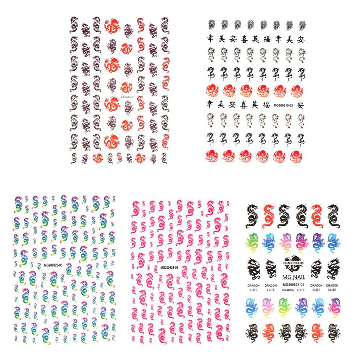 Quantity: 5 sheets Size: 12*9cm Style: Dragon,Characters Material: Paper Color:as picture shows VERY EASY TO USE: Select a design and peel off by your nail. Place the design on nail/tip and rub it gently several times. Apply top coat for the best result. Package Included:5 Sheets SAFETY WARNING Not suitable for children under 25 years old