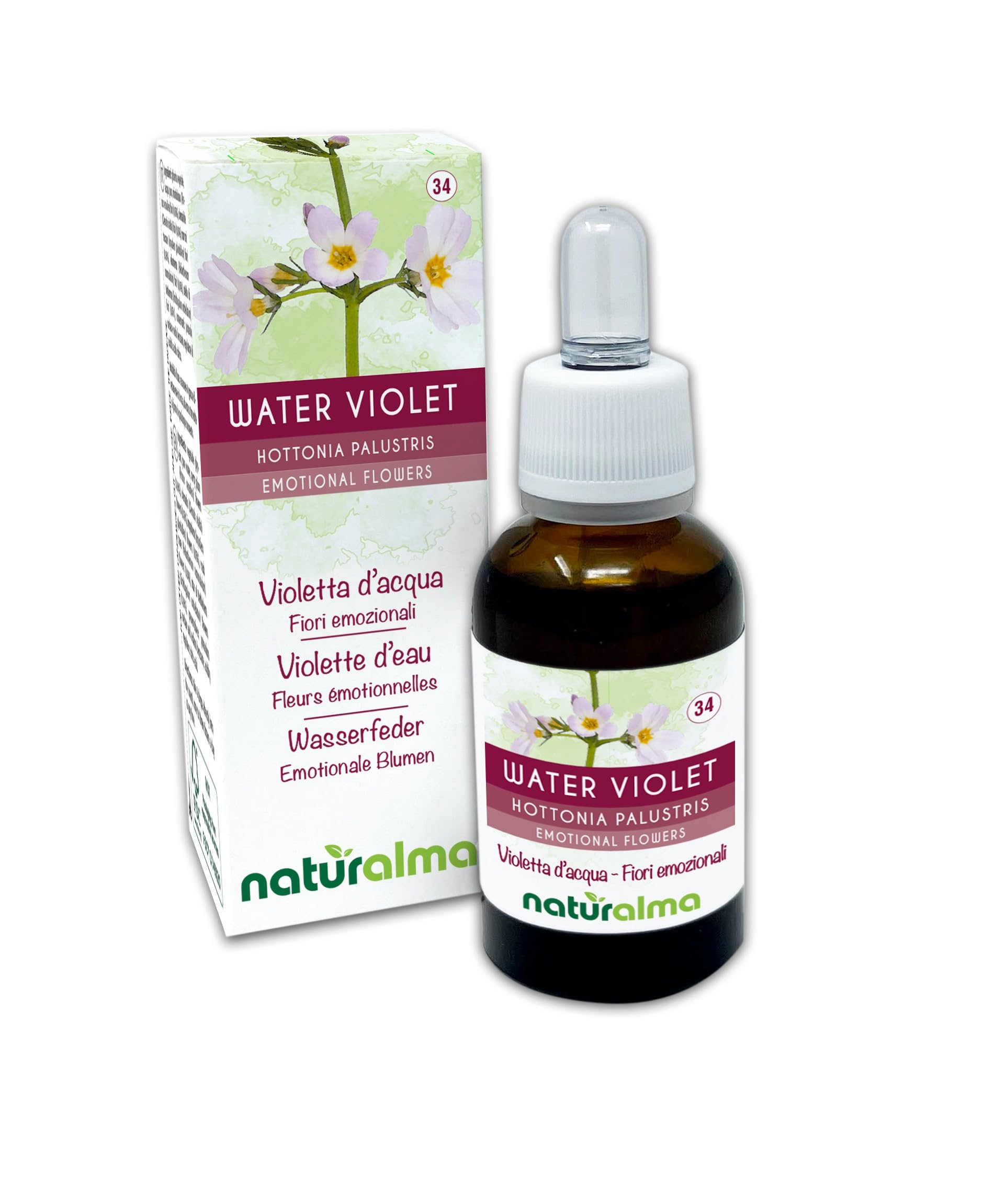 NATURALLY WITH YOU: We pay close attention to you. It's part of our philosophy. That's why, in addition to developing products designed to meet your needs, we work on unique formulas and strive for a perfect synergy of ingredients and dosages. We are available to advise you on your goals, provide information about each product, and answer all your questions. NATURALMA – Natural Habits. We believe it is essential to guarantee quality and safety. That's why we carefully select our raw materials and produce our products in Italy. A NATURAL ALLY: Water Violet (Hottonia palustris) Emotional Flowers or Bach Flowers in drops. To restore emotional and energetic balance, we recommend taking 4 drops directly in your mouth or diluted in a glass of water one to three times a day at any time. Naturalma flower essences are suitable for vegans. They are free of alcohol, colorings, flavorings, and artificial sweeteners. Water violet (Hottonia palustris) Emotional Flowers or Bach Flowers Naturalma are alcohol-free and pleasantly flavored. Flower essences are natural remedies used to rebalance emotions or states of mind. Indeed, each flower corresponds to a particular feeling or emotion. Naturalma Emotional Flowers are floral remedies similar to traditional Bach Flowers. Water violet (Hottonia palustris) Emotional Flowers or Bach Flowers Naturalma are available in drops, in a large family size (30 ml). Thanks to a special extraction method, the alcohol is removed while keeping the flower essences intact. Our products are alcohol-free, but they are just as concentrated as the original flower essences prepared by maceration in brandy.NATURELLEMENT AVEC VOUS : Nous portons une grande attention à votre égard. Cela fait partie de notre philosophie. C'est pour cela qu'en plus d'élaborer des produits conçus pour répondre à vos exigences, nous travaillons sur des formules uniques et cherchons à obtenir une synergie parfaite des ingrédients et des dosages. Nous nous tenons à votre disposition pour vous conseiller dans vos objectifs, vous fournir les informations relatives à chaque produit et répondre à toutes vos demandes. NATURALMA – Des habitudes naturelles. Nous pensons qu'il est primordial de vous garantir la qualité et la sécurité. C'est pour cette raison que nous choisissons nos matières premières avec soin, que nous produisons nos produits en Italie. UN ALLIÉ NATUREL : Water violet ou Violette d'eau (Hottonia palustris) Fleurs émotionnelles ou Fleurs de Bach en gouttes. Pour retrouver un bon équilibre émotionnel et énergétique, nous vous conseillons de prendre 4 gouttes directement dans votre bouche ou diluées dans un verre d'eau une à trois fois par jour à tout moment de la journée. Les essences florales Naturalma conviennent aux végétaliens. Elles sont sans alcool, colorants, arômes ni édulcorants artificiels. Water violet ou Violette d'eau (Hottonia palustris) Fleurs émotionnelles ou Fleurs de Bach Naturalma sont sans alcool et à la saveur agréable. Les essences florales sont des remèdes naturels employés pour rééquilibrer les émotions ou les états d'âme. En effet, chaque fleur correspond à un sentiment ou une émotion en particulier. Les Fleurs émotionnelles Naturalma sont des remèdes floraux analogues aux Fleurs de Bach traditionnelles. Water violet ou Violette d'eau (Hottonia palustris) Fleurs émotionnelles ou Fleurs de Bach Naturalma en gouttes, grand format familial (30 ml). Grâce à une méthode spéciale d'extraction, l'alcool est éliminé tout en maintenant intacte les essences florales. Nos produits sont sans alcool, mais ils sont tout aussi concentrés que les Essences florales originales préparées via macération dans du Brandy.Water violet ou Violette d'eau (Hottonia palustris) Fleurs émotionnelles ou Fleurs de Bach Naturalma - Gouttes 30 ml - Extrait liquide sans alcool - Essences florales - Vegan