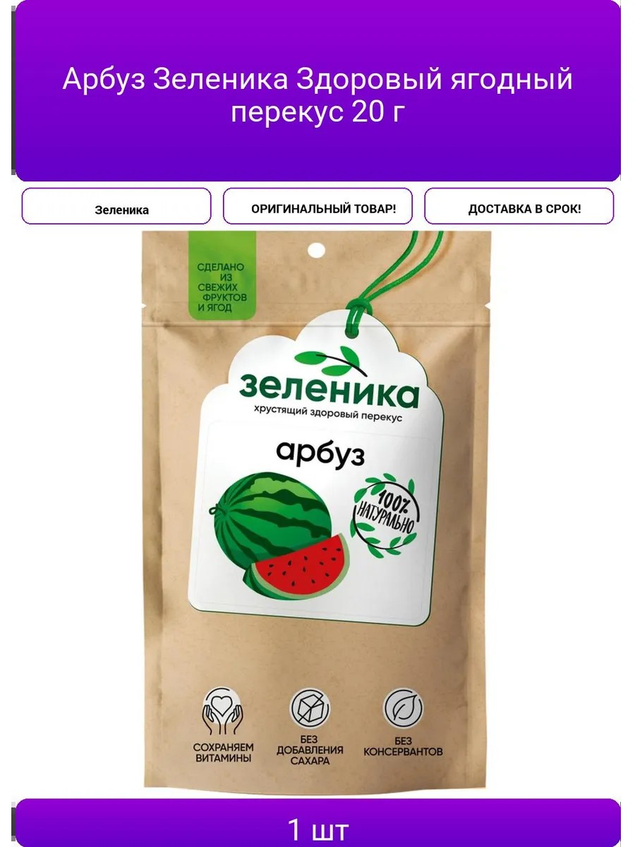| Комплектация | Арбуз Зеленика Здоровый ягодный перекус 20 г |