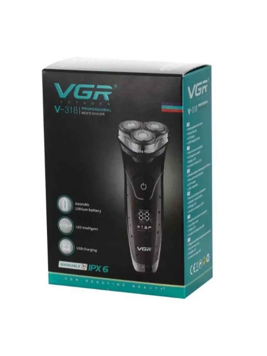 Наслаждайтесь свободой бритья в любом месте и в любых условиях с электробритвой V-318, которая обеспечит Вам быстрое и гладкое бритьё без раздражения кожи. Благодаря встроенной технологии водостойкости у вас есть возможность выбора сухого или мокрого бритья и даже бритья в душе. Вы будете поражены простотой использования электробритвой, так как благодаря уникальному запатентованному эргономичному дизайну она идеально помещается в ладони, обеспечивая бритьё труднодоступных мест в считанные секунды. Три плавающих головки подстраиваются под контуры лица, не повреждают кожу. После бритья их защитные сеточки открываются и промываются водой. С обратной стороны бритвы размещен триммер, который открывается легким нажатием. Вы всегда сможете подравнять контуры висков, усы, бороду.