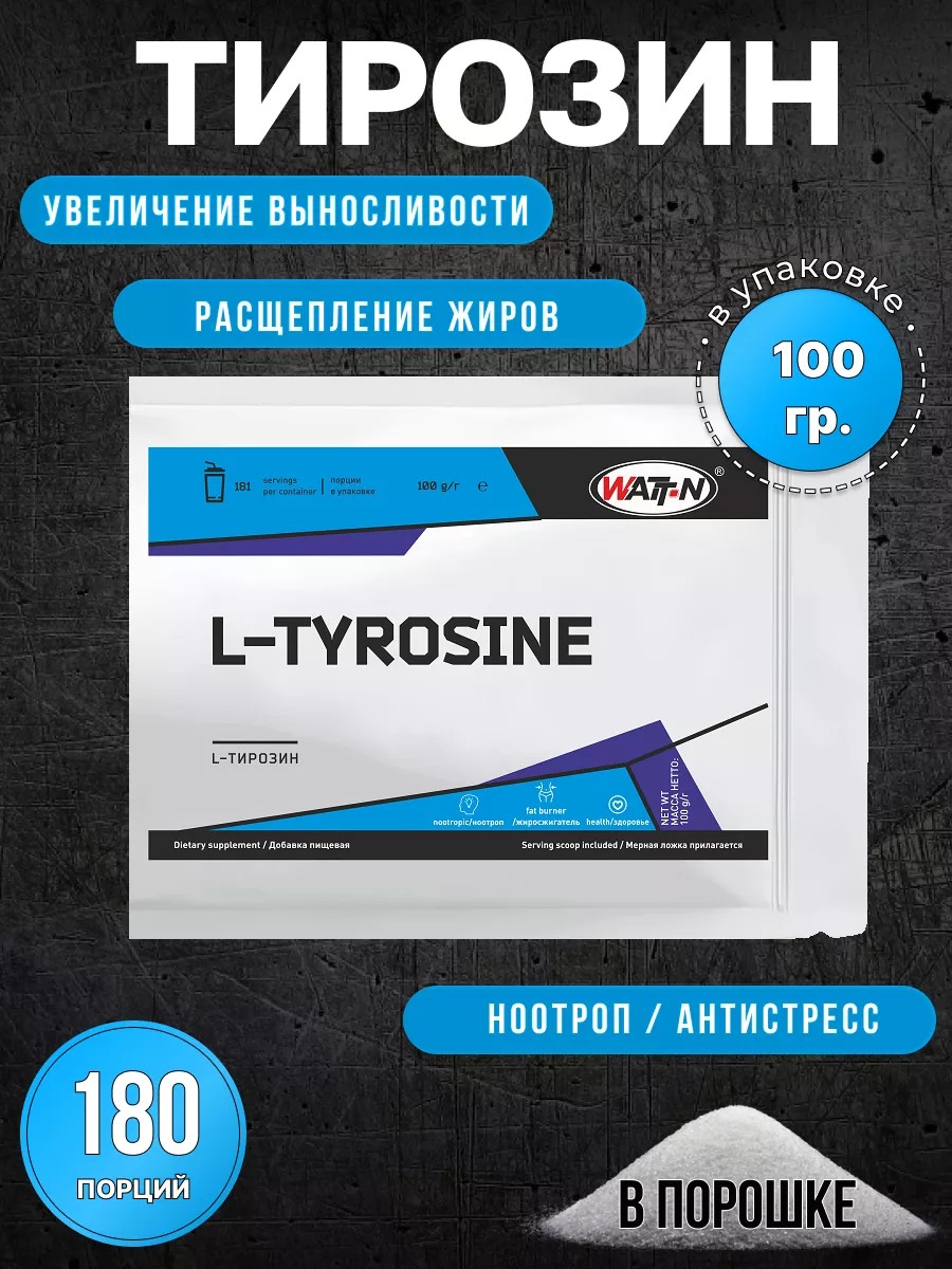 L-Тирозин / L-Tirosine – это заменимая аминокислота, которая входит в состав белков. В человеческом организме синтез Тирозина происходит путем преобразования аминокислоты L-Фенилаланина, получаемого из пищи. Тирозин помогает атлетам избежать перетренированности, благодаря его способности устранять утомление и увеличивать выносливость. Являясь прекурсором дофамина, тирозин может улучшать ментальную концентрацию и улучшать технику выполнения упражнений, улучшает самочувствие и настроение. Во время кардио тренировок Тирозин помогает сохранить мышечную ткань от разрушающего воздействия катаболических процессов. Таким образом, аминокислота Тирозин может использоваться как компонент спортивного питания, для сжигания жира и сохранения мышц. Тирозин является предшественником необходимых для человека гормонов. В мозговом веществе надпочечников из него образуются дофамин, адреналин и норадреналин, а в щитовидной железе тирозин предшествует появлению тироксина и трийодтеронина. Хронический дефицит L-тирозина может привести к возникновению тяжелых физических и умственных нарушений. Именно поэтому так важно следить за количественным поступлением этой аминокислоты, и в случае появления первых признаков ее недостатка срочно принимать меры.