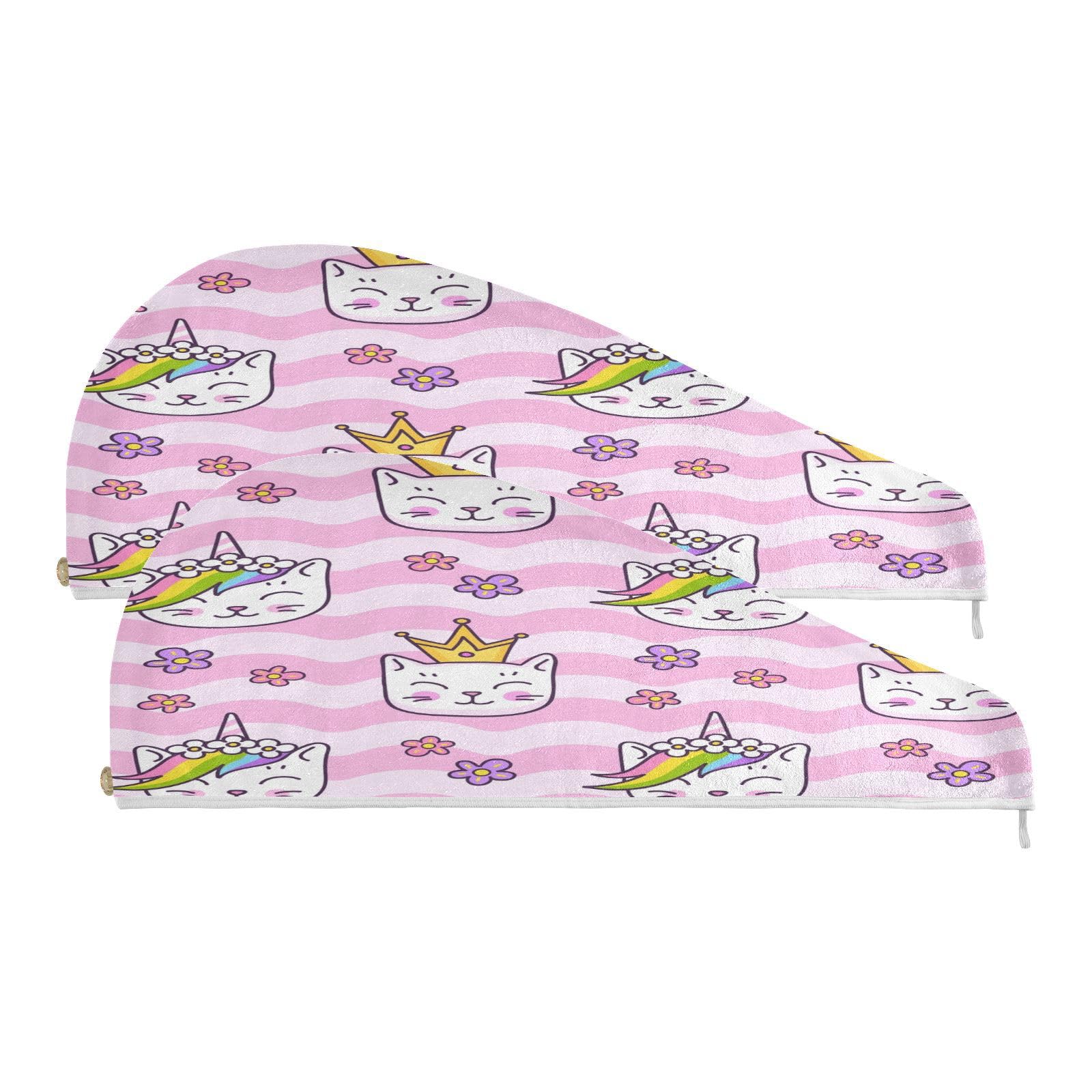 Wavy Pink Cat Dry Hair Cap 2 Piece Quick Drying Towel Set with Button Headband Super Absorbent Soft & Comfortable