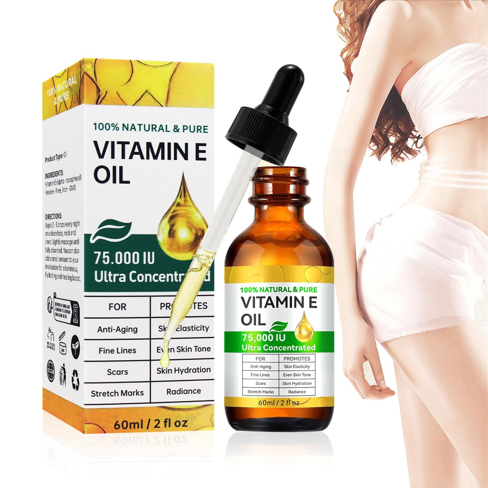 Experience the transformative power of our vitamin E oil, a natural and effective solution for all your skin, hair and nail care needs. Our vitamin E oil consists of 100 pure and natural ingredients and is rich in antioxidants and essential nutrients that moisturize and provide nutrients to the skin, hair and nails. Vitamin E's antioxidant properties protect against free radical damage, reduce the appearance of fine lines and wrinkles, and improve skin elasticity for a youthful and radiant complexion. Its moisturizing properties help replenish dry and dehydrated skin, leaving it soft, smooth and healthy-looking. This versatile oil can be used in a variety of ways, making it a must-have in your beauty arsenal. Use it as a facial moisturizer, as a hair treatment, as a cuticle oil or add a few drops to your favorite care products to get an extra moisture boost and protection. We are committed to sustainability and ethical sourcing and ensure that our vitamin E oil is free from animal cruelty and environmentally friendly. Give your skin, hair and nails the nourishing effect of vitamin E with our high-quality oil and discover the beauty of natural skin care. Product specifications. Product name: Vitamin E Material: liquid. Package dimensions: 12 x 4 x 4 cm. Package weight: 150 g SAFETY WARNING none5. Cruelty-Free Sustainable: Our Vitamin E oil is cruelty-free and ethically sourced, making it a safe and eco-friendly choice for your beauty routine. 4th Versatile use: This versatile oil can be used as a moisturizer, hair treatment, cuticle oil or as an addition to your favorite skin care products to give skin an extra moisture boost and protection. 3rd Anti-aging Benefits: Vitamin E's strong antioxidant properties help fight free radical damage, reduce wrinkles and improve skin elasticity to give it a more youthful appearance. 2nd Caring and moisturizing: this vitamin E oil is rich in antioxidants and essential nutrients that deeply nourish and hydrate skin, hair and nails. 1st Pure and Effective: Our Vitamin E oil is made from 100 pure and natural ingredients to ensure maximum efficacy and potency.Vitamine E-olie, 60 ml, natuurlijke vitamine E voor huidverzorging en anti-aging, hydraterend, rimpelbestrijding, littekenverzorging, geschikt voor alle huidtypes Ervaar de transformerende kracht van onze vitamine E-olie, een natuurlijke en effectieve oplossing voor al je behoeften op het gebied van huid-, haar- en nagelverzorging. Onze vitamine E-olie bestaat uit 100 zuivere en natuurlijke ingrediënten en is rijk aan antioxidanten en essentiële voedingsstoffen die huid, haar en nagels hydrateren en voedingsstoffen voorzien. De antioxiderende eigenschappen van vitamine E beschermen tegen schade door vrije radicalen, verminderen het uiterlijk van fijne lijntjes en rimpels en verbeteren de elasticiteit van de huid voor een jeugdige en stralende teint. De hydraterende eigenschappen helpen om de droge en gedehydrateerde huid weer aan te vullen, zodat deze zacht, glad en gezond straalt. Deze veelzijdige olie kan op verschillende manieren worden gebruikt, wat het tot een must in je beauty-arsenaal maakt. Gebruik het als vochtinbrengende crème voor het gezicht, als haarbehandeling, als nagelriemolie of voeg een paar druppels toe aan je favoriete verzorgingsproducten om een extra vochtboost en bescherming te krijgen. Wij zetten ons in voor duurzaamheid en ethische inkoop en zorgen ervoor dat onze vitamine E-olie vrij is van dierenmishandeling en milieuvriendelijk. Gun je huid, haar en nagels de voedende werking van vitamine E met onze hoogwaardige olie en ontdek de schoonheid van de natuurlijke huidverzorging. Productspecificaties. Productnaam: Vitamine E Materiaal: vloeibaar. Afmetingen verpakking: 12 x 4 x 4 cm. Gewicht verpakking: 150 g VEILIGHEIDSWAARSCHUWING geen5. Wreedheidsvrij en duurzaam: onze vitamine E-olie is vrij van dierenmishandeling en is afkomstig uit ethische bronnen, waardoor het een veilige en milieuvriendelijke keuze is voor je schoonheidsroutine. 4de Veelzijdig te gebruiken: deze veelzijdige olie kan worden gebruikt als vochtinbrengende crème, haarbehandeling, nagelriemolie of als toevoeging aan je favoriete huidverzorgingsproducten om de huid extra vochtboost en bescherming te geven. 3de Anti-aging voordelen: de sterke antioxiderende eigenschappen van vitamine E helpen schade door vrije radicalen te bestrijden, rimpels te verminderen en de elasticiteit van de huid te verbeteren om het een jeugdiger uiterlijk te geven. 2de Verzorgend en hydraterend: deze vitamine E-olie is rijk aan antioxidanten en essentiële voedingsstoffen die huid, haar en nagels diep voeden en hydrateren. 1ste Zuiver en effectief: onze vitamine E-olie is gemaakt van 100 pure en natuurlijke ingrediënten om maximale werkzaamheid en potentie te garanderen.