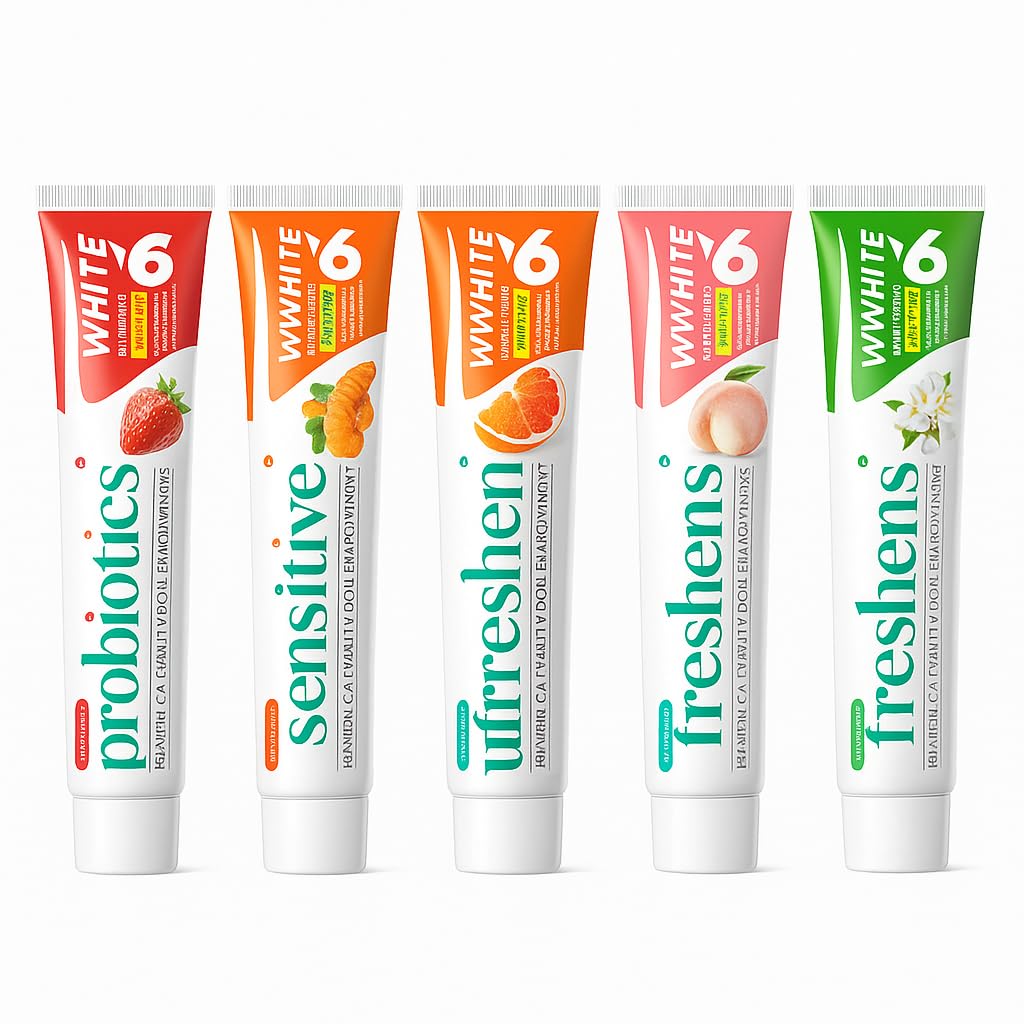 5 ? 5-Pack Value Daily Oral Care This 5-pack set offers whitening, stain removal, enamel repair, and breath-freshening benefits in one. Perfect for daily use and suitable for the whole family. 4 ? 5 Unique Natural Flavors Enjoy five delightful options — Strawberry, Peach, Jasmine, Turmeric, and Grapefruit — each providing a fresh, natural taste while keeping your teeth bright and healthy. 3 ? Fresh Breath All Day Infused with refreshing mint and fruit essence, it removes odor-causing bacteria for a clean and confident smile that lasts throughout the day. 2 ? Fluoride-Free Enamel Safe Formula Made with natural ingredients and probiotics, our toothpaste is fluoride-free and safe for sensitive teeth. Helps strengthen enamel and protect gums for long-term oral health. 1 ? Whitening Stain Removal Power Effectively removes stubborn coffee, tea, and tobacco stains, restoring your natural white smile. This whitening toothpaste set gently polishes away discoloration without damaging enamel.
