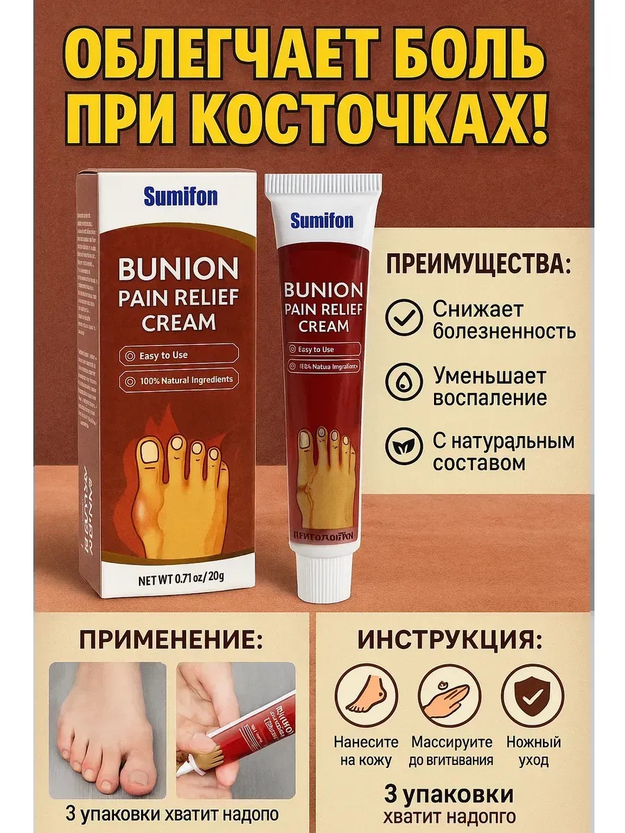 The result of using Sumifun Bunion Pain Relief Cream is a noticeable reduction in pain, relief of inflammation and swelling, and improved mobility of the big toe joint. The product helps restore walking comfort, relieve leg fatigue after a long day, and prevent the progression of deformity with regular use.