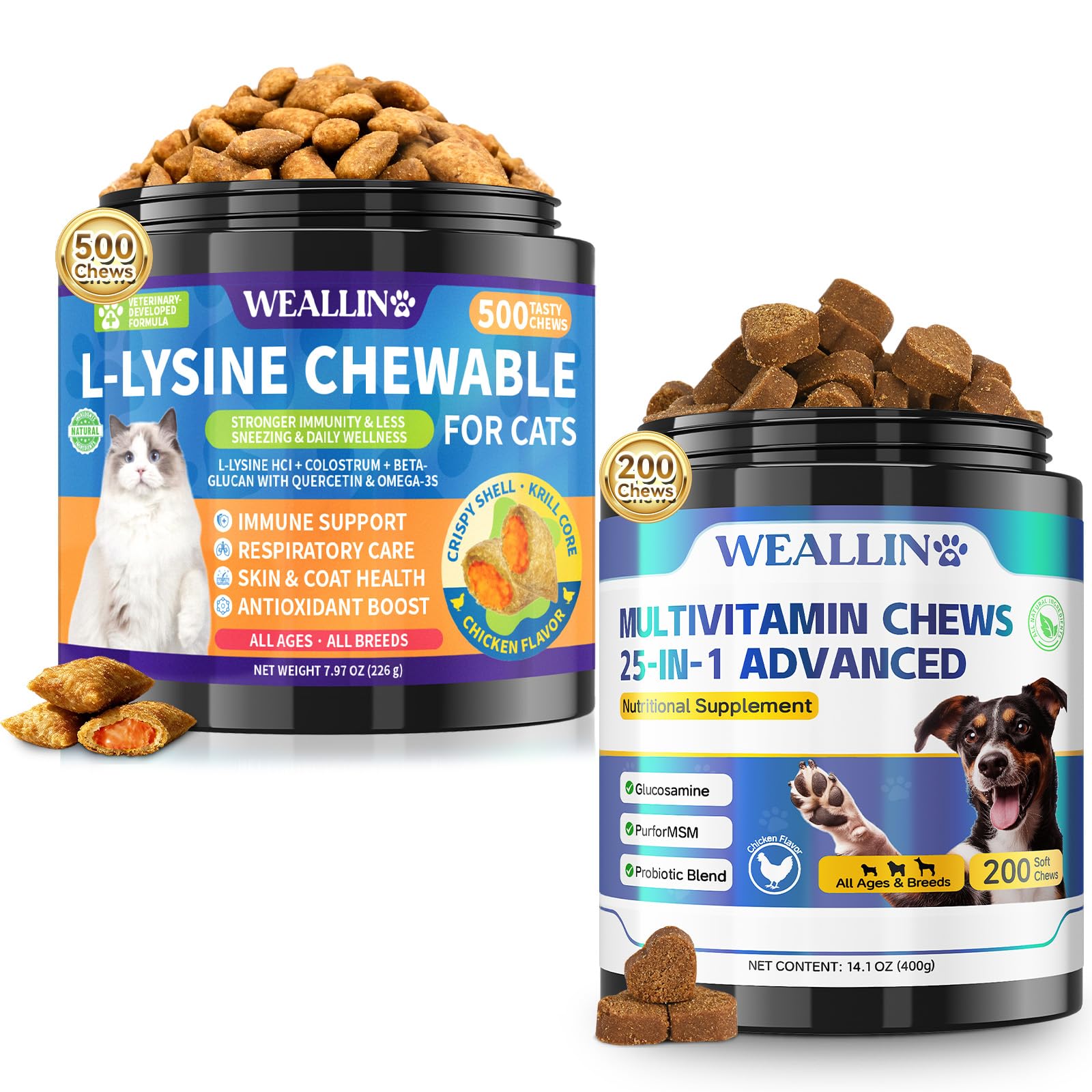Cat Dog Wellness Bundle – L-Lysine Chews for Cats 500 Ct for Immune Respiratory Support 25-in-1 Dog Multivitamin Chews 200 Ct with Probiotics Omega-3, Chicken Flavor500 Chews Long-Term Multi-Cat Friendly: Each jar contains 500 crunchy, krill-core chews for cats— ideal for long-term daily support or multi-cat households. Gentle, tasty, and reliable, WEALLIN L-Lysine Chews for Cats turn essential immune and respiratory care into a sustainable, treat-like experience cats love and pet parents trust. Overall Health Skin Coat Vitality: Lysine is an essential amino acid that plays a vital role in cats' overall well-being, yet their bodies cannot synthesize it naturally. Daily support helps maintain immune and respiratory health in kittens and cats, supporting their overall well-being. With fish oil rich in Omega-3, WEALLIN L-Lysine chews go beyond respiratory care to promote healthy skin and a glossy coat, and maintain visible wellness from the inside out. Immune Support Respiratory Defense: Packed with L-Lysine and colostrum, these cat lysine chews help enhance immunity and ease sneezing, runny nose, and watery eyes. Beta-Glucan supports natural defenses, while quercetin and Omega-3s provide respiratory support and skin and coat care. Consistent daily use helps cats stay active, comfortable, and thriving. Daily Wellness Treat-Like Experience: WEALLIN's small, crispy L-Lysine chews for cats are designed to be given in multiple pieces per day (about 1 chew per 1 lb of body weight). This small-piece format makes care more precise and gentler for cats, while also working perfectly as training rewards or bonding treats, making daily immune and respiratory support a natural, enjoyable part of your cat's routine. Immune Respiratory Support Krill Core Chicken Flavor: Formulated for all breeds and ages, these cat L-Lysine chews provide comprehensive immune and respiratory care. Enriched with L-Lysine HCI colostrum beta-glucan quercetin Omega-3s, the formula helps support respiratory function, eye and nose health, and overall immunity. Each WEALLIN lysine chews for cats features a crispy shell with a krill-infused core and savory chicken flavor — easy to digest and loved by picky eaters.