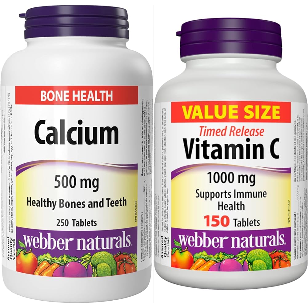 Webber Naturals Calcium Carbonate, 250 Tablets, Helps Support Bones and Teeth Calcium Carbonate from Webber Naturals is an ideal supplement for the improvement and maintenance of strong bones and teeth, as well as maintenance of optimal overall health. Calcium is needed to form strong bones and teeth, healthy gums and for the maintenance of a regular heart beat and nerve impulse transmission. Webber Naturals Vitamin C Timed Release 1000 mg, 150 Tablets, For Bones, Teeth, Immune and Antioxidant Health Timed Release Vitamin C from Webber Naturals provides 1000 mg of vitamin C for ongoing immune support throughout the day. Vitamin C is an antioxidant that helps in the development and maintenance of bones, cartilage, teeth, and gums.Vitamin C supports immune system function, wound healing, connective tissue formation, and healthy gums and teeth. Calcium Carbonate tablets are free of artificial colors, preservatives, sweeteners, dairy, starch, sugar, wheat, gluten, yeast, soy, egg, salt, tree nuts, and GMOs. Timed-release Vitamin C provides a gradual release over several hours, reducing the risk of gastrointestinal upset associated with high doses of regular Vitamin C. Calcium Carbonate helps prevent mineral deficiency and may reduce the risk of developing osteoporosis when combined with a healthy diet, Vitamin D, and regular exercise. Supports bone and teeth health with 500 mg of Calcium Carbonate per tablet and 1,000 mg of timed-release Vitamin C for antioxidant protection and immune system support.