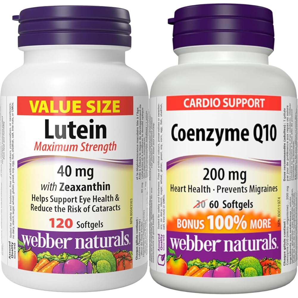 Webber Naturals Lutein 40 mg with Zeaxanthin, Maximum Strength, 120 Softgels, Supports Eye Health Lutein with Zeaxanthin Maximum Strength from Webber Naturals contains purified lutein and zeaxanthin, major carotenoid pigments found within the macula and retina of the eye. As antioxidants, lutein and zeaxanthin help support eyesight in conditions associated with sunlight damage that can lead to age-related macular degeneration (AMD), and other eye conditions. Webber Naturals Coenzyme Q10 (CoQ10) 200mg, High Potency Antioxidant, Non-GMO, Gluten Free, 60 softgels, for Heart Health and Cellular Energy Production Coenzyme Q10 200 mg from Webber Naturals is an antioxidant nutrient that supports heart health and helps reduce the frequency of migraine headaches. CoQ10 is produced in the body, but natural CoQ10 synthesis declines with age and with certain health conditions. This one-a-day formula provides 200 mg of CoQ10 per softgel.Product 2: FREE OF: artificial colors, preservatives or sweeteners, NO: diary, starch, sugar, wheat, gluten, yeast, soy, corn, egg, fish, shellfish, salt, tree nuts or GMOs. Product 2: ANTIOXIDANTS PREVENT or slow cellular oxidation. Similar to the action of rust on metal, oxidation in the body weakens and destroys cells and may accelerate the aging process. Product 2: COENZYME Q10: An antioxidant nutrient that is essential for cellular energy production. Particularly important for heart health, CoQ10 levels are depleted by age and by the use of certain medications called statin drugs. Product 2: SUPPORT CARDIOVASCULAR HEALTH: Our bodies can produce CoQ10 but our levels of CoQ10 begin to decline between the ages of 20 and 40. CoQ10 supplements from Webber Naturals can help support cardiovascular health and cellular energy production. Product 1: Each Softgel Contains: 40 mg of Lutein and 7 mg of Zeaxanthin. Product 1: One-Per-Day: Lutein with Zeaxanthin Maximum Strength is an ideal choice for people with a limited daily intake of lutein. Product 1: Antioxidant Protection: Lutein and zeaxanthin are major carotenoid pigments that are highly concentrated within the macula and retina of the eyes. Together, they improve macular pigment optical density and provide antioxidant protection for the maintenance of eye health. This is critical because the retina is especially vulnerable to oxidative stress because of its high exposure to light and high oxygen demands. Product 1: Support Eye Health: Lutein with Zeaxanthin helps supports healthy eyes and vision in people with conditions associated with sunlight damage, such as age-related macular degeneration (AMD), and people concerned about the effects of the sun’s UV rays on their eyes.