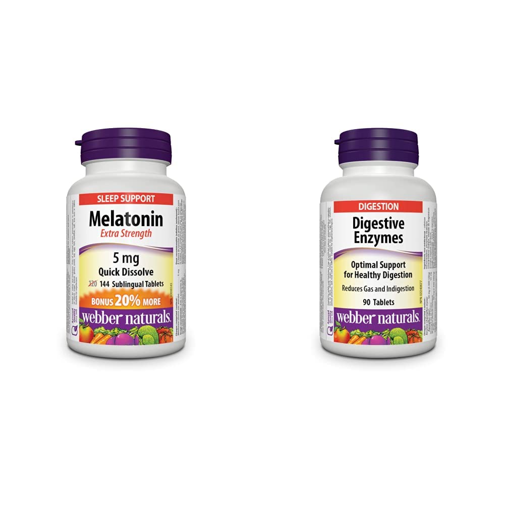 Webber Naturals Melatonin 5 mg Extra Strength, 144 Quick Dissolve Tablets, For Sleep Support, Vegetarian Melatonin 5 mg from Webber Naturals works with the body's natural cycles to help reset your internal clock. Taken 30–90 minutes before bedtime, melatonin can help you fall asleep faster, stay asleep longer, and get better quality sleep, which help reduce daytime fatigue. Melatonin 5 mg from Webber Naturals is suitable for vegetarians, non-GMO, and comes in an easy-dissolve sublingual tablet to ensure fast, consistent absorption. Webber Naturals Digestive Enzymes for Proteins and Carbohydrates, 90 Tablets Webber Naturals digestive enzymes tablets for better digestion and overall health. Enzymes are essential for digestion and providing cellular energy. Digestive enzymes break down our food, enabling the nutrients and energy to be absorbed into the bloodstream. The body uses stored nutrients and energy to repair tissues and cells. Supplementation can prevent or reduce gas and bloating, may stop or reduce adverse food reactions, and can reduce the inflammation and pain of arthritis and sports injuries. Contains amylase, it assists in breaking down starch into simple sugars, papain which helps in protein digestion and has anti-inflammatory and wound-healing properties, betaine hydrochloride helps those who are deficient in stomach acid, aids protein digestion and may reduce food sensitivities and bromelain assists in protein digestion and provides anti inflammatory properties. Includes 90 tablets per pack.Both Melatonin and Digestive Enzymes products from Webber Naturals are free of artificial colors, preservatives, sweeteners, starch, sugar, wheat, gluten, yeast, soy, egg, fish, shellfish, salt, tree nuts or GMOs, suitable for vegetarians vegans. Melatonin is available in various strengths (1, 3, 5, and 10 mg) and formats (liquid, gummies, sublingual and tablets) from Webber Naturals to suit individual needs. Digestive enzymes tablets assist in breaking down food and enable better nutrient absorption into the bloodstream, providing anti-inflammatory properties. Webber Naturals Melatonin 5 mg Extra Strength peppermint flavored quick dissolve tablets easily dissolve under the tongue with no water needed for faster absorption. Melatonin supplements are non-habit forming, natural nighttime sleep aid that can help regulate sleep patterns, taking 30–90 minutes before bedtime to reduce time to fall asleep and improve sleep quality.